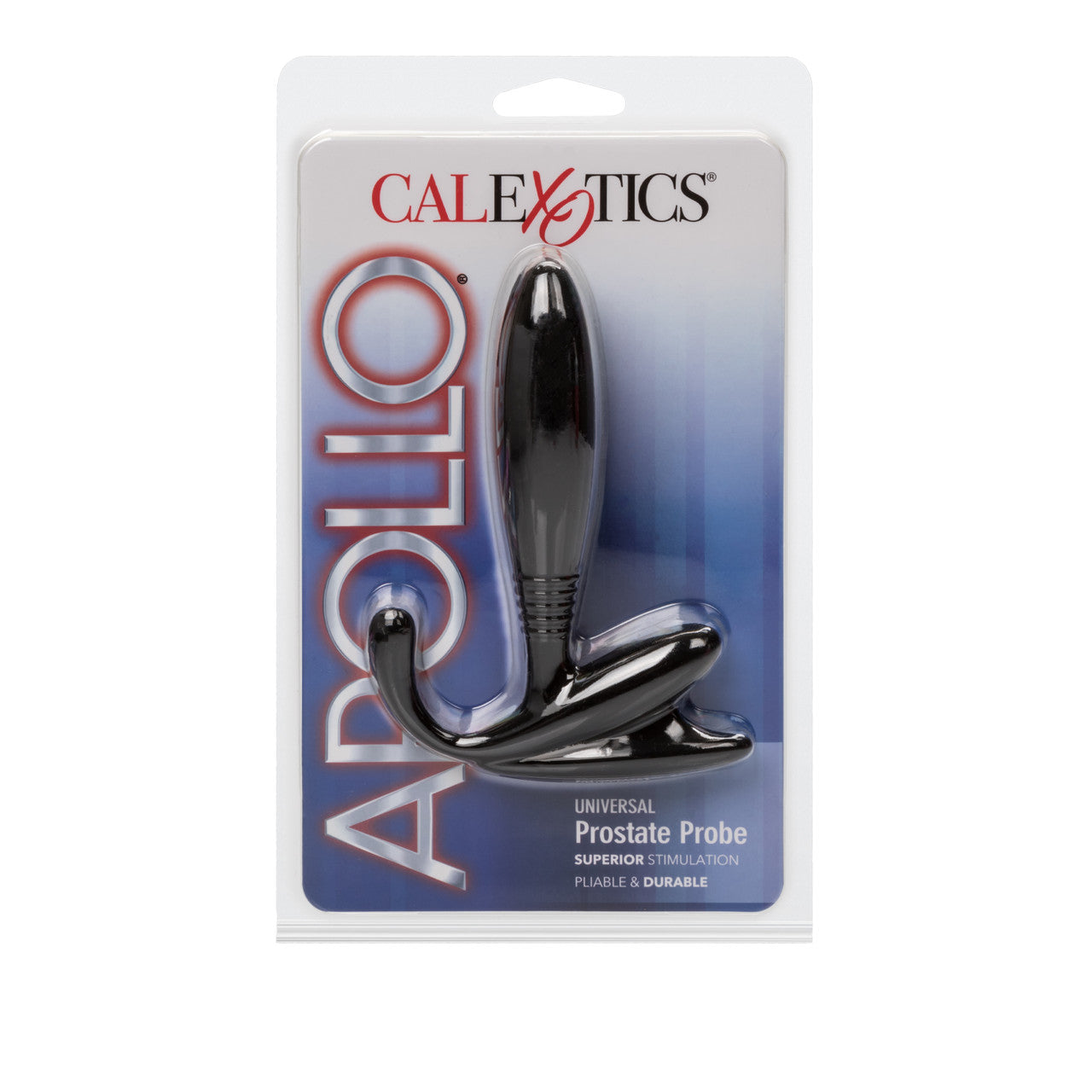 Apollo Universal Prostate Probe Superior Stimulation. Pliable and durable Black from California Exotic Novelties. For gratifying Prostate pleasure, Apollo Universal Prostate Probes offer the perfect design to reach the sweetest spots on the Prostate gland and all along the anal canal. Pliable, durable, and virtually seamless, this sophisticated Prostate Probe has an easy pull handle and is crafted from smooth, unscented and phthalate free Thermoplastic Rubber TPR. You will be as safe as you are supremely gratified with our beautifully shaped probes. Designed for easy use and the ultimate in pleasurable maneuvers, these probes are comfortable, able to flex for comfort while staying strong for simple and stimulating insertion. You will find the entire anal area stimulated, including the perineum. And once it glides in place, this probe's smooth curves slant for superior alignment with the sensitive rectum. A gently rounded tickler is an integral part of this sleek design, applying pressure in the highly sensitive and stimulating area between the Anus and Testicles, massaging right along with the internal stimulation. Compatible with both Water Based Personal Lubricants and Silicone Based Lubricants, enjoy the exciting sensation and gratification. Pliable, durable, virtually seamless Prostate Probe. Easy pull handle. Safe and pure for body and pleasure made using phthalate free, non-toxic materials. Size 3.5 inches by 1 inch. Bulk Weight: 1.3 ounces. 1 year warranty. Cal Exotics categories: For Men, Anal Toys, Probes. Colors may vary. Categories for Apollo Prostate Probe: Anal Toys, Prostate Massagers, P-Spot Stimulators, Prostate Massagers, Probes, Sticks and Rods. 2023