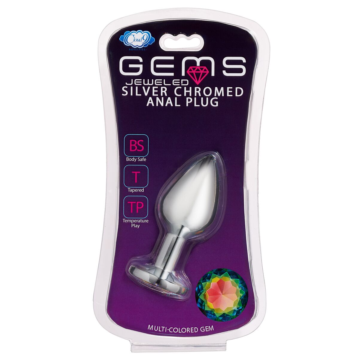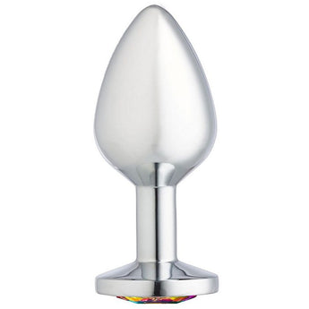 Cloud 9 Gems Silver Chromed Anal Plug Medium. Cloud 9 Novelties Anal Gems Jeweled Silver Chromed Anal Plug. Anal Jewelry decorated with a stunning rainbow multicolor gem. Silver chromed wearable stainless steel butt plug featuring a jeweled beauty for your booty. Cloud 9 Jeweled Gems.