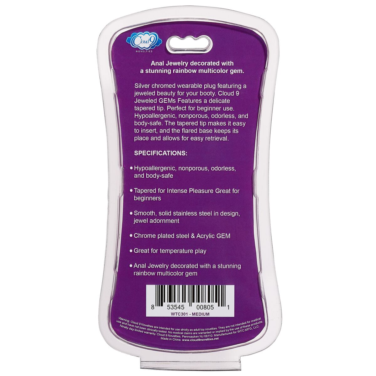 Features: a delicate tapered tip. Perfect for beginner use. Hypoallergenic, nonporous, odorless, and body safe. The tapered tip makes it easy to insert, and the flared base keeps its place and allows for easy retrieval. The sparkling jewel makes playtime fun. This Cloud 9 Jeweled Anal Plug is excellent for temperature play when you prepare it in hot or cold water. This Cloud 9 Gem anal plug is both visually stunning and ideal for stimulating anal play. Compatible with water based lubricants. Clean with mild soap and warm water after use. Easy to clean.Top rack dishwasher safe. Hypoallergenic, nonporous, odorless, and body safe. Tapered for intense pleasure great for beginners. Smooth, solid stainless steel in design, jewel adornment. Chrome Plated Stainless Steel butt plug, Acrylic Gem. Great for temperature play. Anal Jewelry decorated with a stunning rainbow multicolor gem. Body safe Stainless Steel and Acrylic Gem. Great for temperature play. Weight .19 pound. Height 3.24 inches, diameter 1.36 inches. Video. Categories: Anal Toys, Small Butt Plugs, Medium Butt Plugs. Video. Amazon Restricted. 2023.