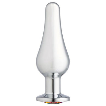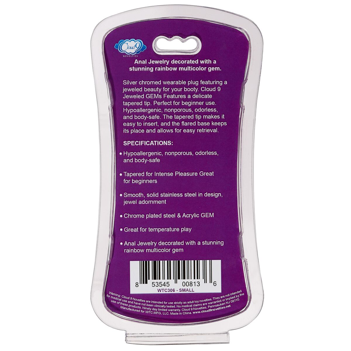 Cloud 9 Gems Silver Chrome Tall Anal Plug Small. New Gems Silver Chromed Anal Plug Tall Tapered Design. Plug with anal jewelry decorated with a stunning rainbow multicolored gem. Hypoallergenic, nonporous, odorless and body safe. Tapered for intense pleasure. Great for beginners. Anal Jewelry decorated with a stunning rainbow multicolor gem. Silver chromed wearable plug featuring a jeweled beauty for your booty. Cloud 9 Jeweled Gems.