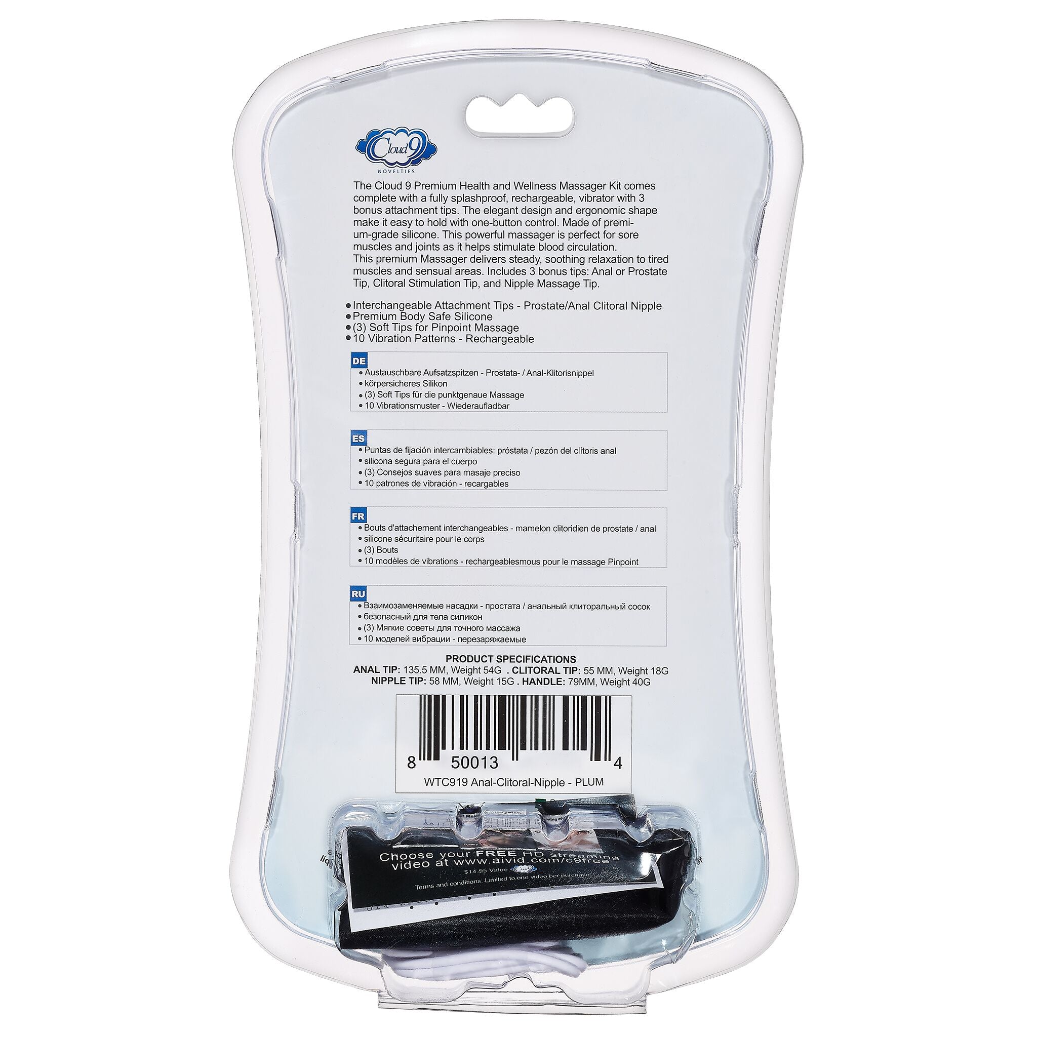 Cloud 9 Health and Wellness Anal, Clitoral and Nipple Massager Kit Plum. The Cloud 9 Premium Health and Wellness Massager Kit comes complete with a fully splashproof for use in the shower only, rechargeable, vibrator with 3 bonus attachment tips. The elegant design and ergonomic shape make it easy to hold with one button control. Made of premium grade silicone. This powerful massager is perfect for sore muscles and joints as it helps stimulate blood circulation. This premium Massager delivers steady, soothing relaxation to tired muscles and sensual areas. Includes 3 bonus tips: Anal or Prostate Tip, Clitoral Stimulation Tip, and Nipple Massage Tip. Weights Anal tip 1.90 ounces, Clitoral tip .63 ounce, Handle 1.41 ounces, Nipple .63 ounce. Dimensions height Anal 5.33 inches. Clitoral 2.16 inches. Handle 3.11 inches, Nipple 2.16 inches.