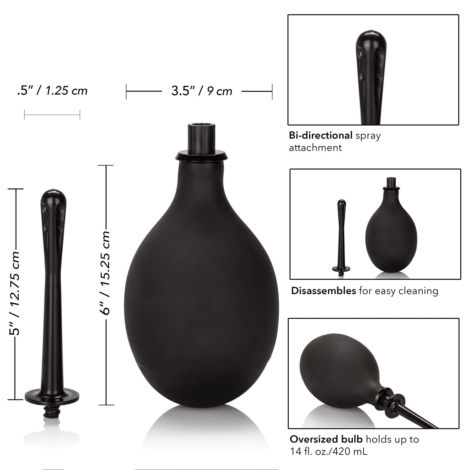 Features: Phthalate Free, Waterproof. Allergens N/A. Measurements: 3.5 inches by 6 inches Bulb. 5 inches by 0.5 inch Probe. Bulk weight 6 ounces. Package 9 ounces. Package 4 inches by 6 inches by 13.25 inches. Categories: Anal Toys, Health and Beauty Aids, Anal Douches, Enemas, Hygiene, Hygiene and Intimate Care. 2024.