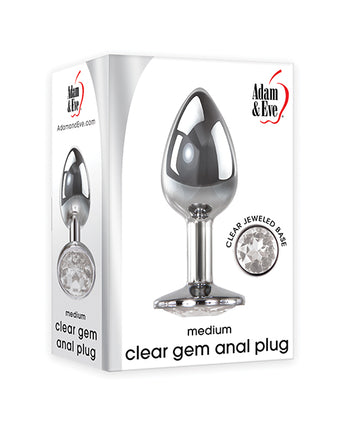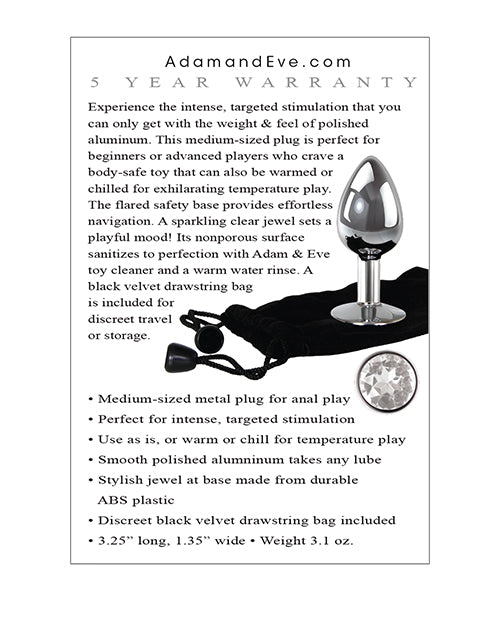 Adam and Eve Clear Gem Anal Plug Medium from Evolved Novelties. Experience the intense, targeted stimulation that you can only get with the weight and feel of polished Aluminum. This Medium Butt Plug is perfect for beginners who crave a body safe toy that can also be warmed or chilled for exhilarating temperature play. The flared safety base provides effortless navigation. A sparkling Clear Gem jewel sets a playful mood! Its non-porous surface sanitizes to perfection with Adam and Eve toy cleaner and a warm water rinse. A Black Velvet Draw String Bag is included for discreet travel or storage. Medium Metal Butt Plug for Anal Sex Play. Perfect for intense targeted stimulation. Use as is, or warm or chill for temperature play. Smooth polished aluminum takes any lube. Stylish jewel at base made from durable ABS Plastic. Discreet Velvet Bag included. Materials for the Clear Gem Medium Plug are safe and pure for body! Aluminum Butt Plug, ABS Plastic Gem on end. Dimensions overall length 3.25 inches, width 1.35 inches. Categories: Categories: Anal Toys, Prostate Massagers, P-Spot Stimulators, Prostate Massagers, Small, Medium Butt Plugs, Probes, Sticks, Rods. 5 years warranty. Video. 2023.