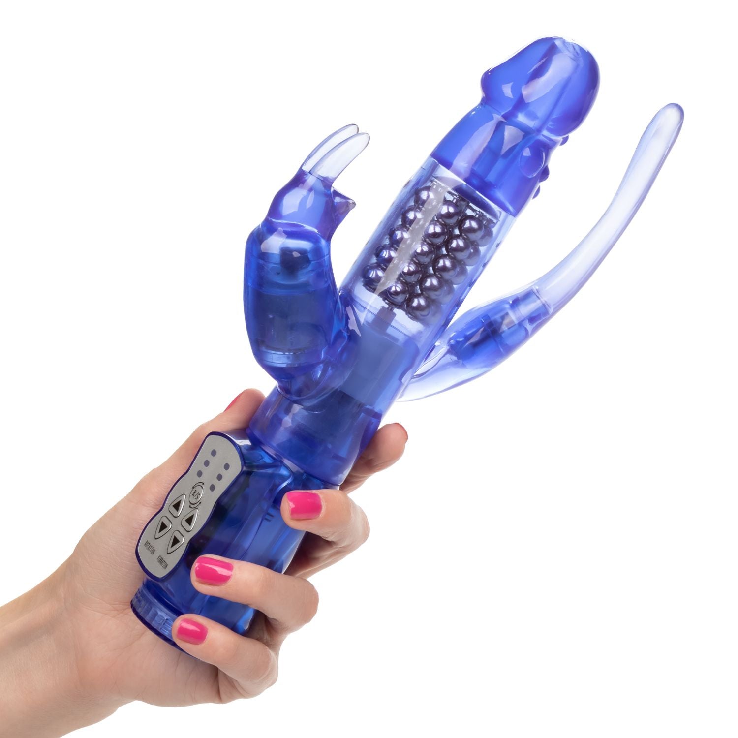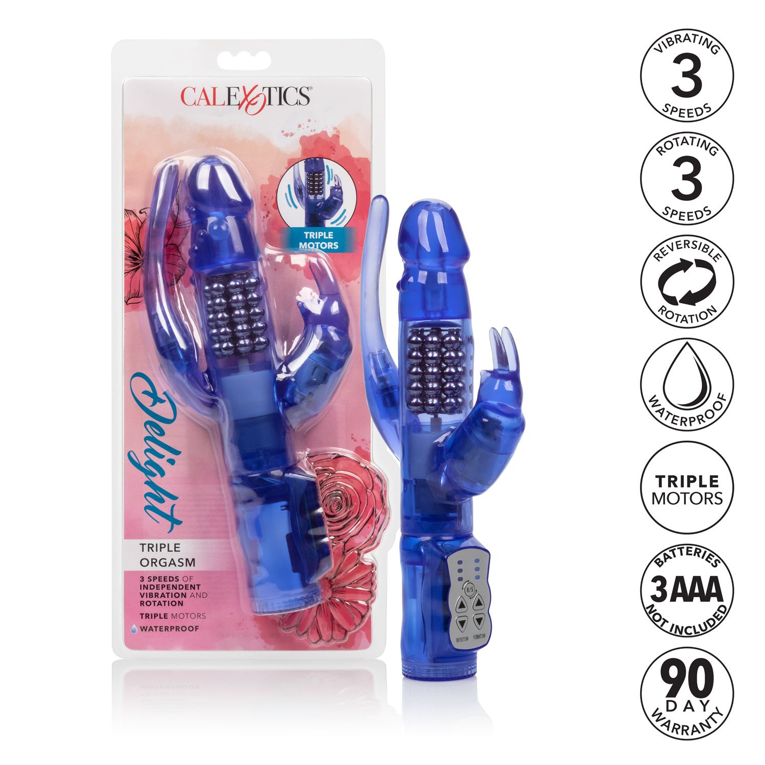 Delight Triple Orgasm Purple Rabbit Style Vibrator from California Exotic Novelties. For the most daring pleasure seekers, the Delight Triple Orgasm vibrator was crafted to deliver thrilling stimulation from every erotic angle. The powerful Rabbit has 3 powerful vibration motors to send spine tingling stimulation throughout the shaft, rabbit teaser and tail tickler. Indulge in a customized pleasure experience with 3 intense vibration speeds and 3 rumbling shaft rotation speeds. Make a splash in the shower, hot tub or bath with a sensationally powerful waterproof massager. 3 knee shaking vibration motors deliver thrilling vibrations throughout the flutter rabbit ears, tickling tail and rotating Shaft. The Pliable, Jelly like tickler and tail shaped anal probe can be used independently from the Shaft rotation functions. Five rows of non-jamming beads deliver deep rumbling stimulation and thrill internal sweet spots to send you spiraling towards orgasmic ecstasy. Use the easy touch control pad to independently control the plethora of pleasure options. Color Purple. Materials Thermoplastic Elastomer TPE, ABS Plastic. Power source: 3 AA batteries, not included.