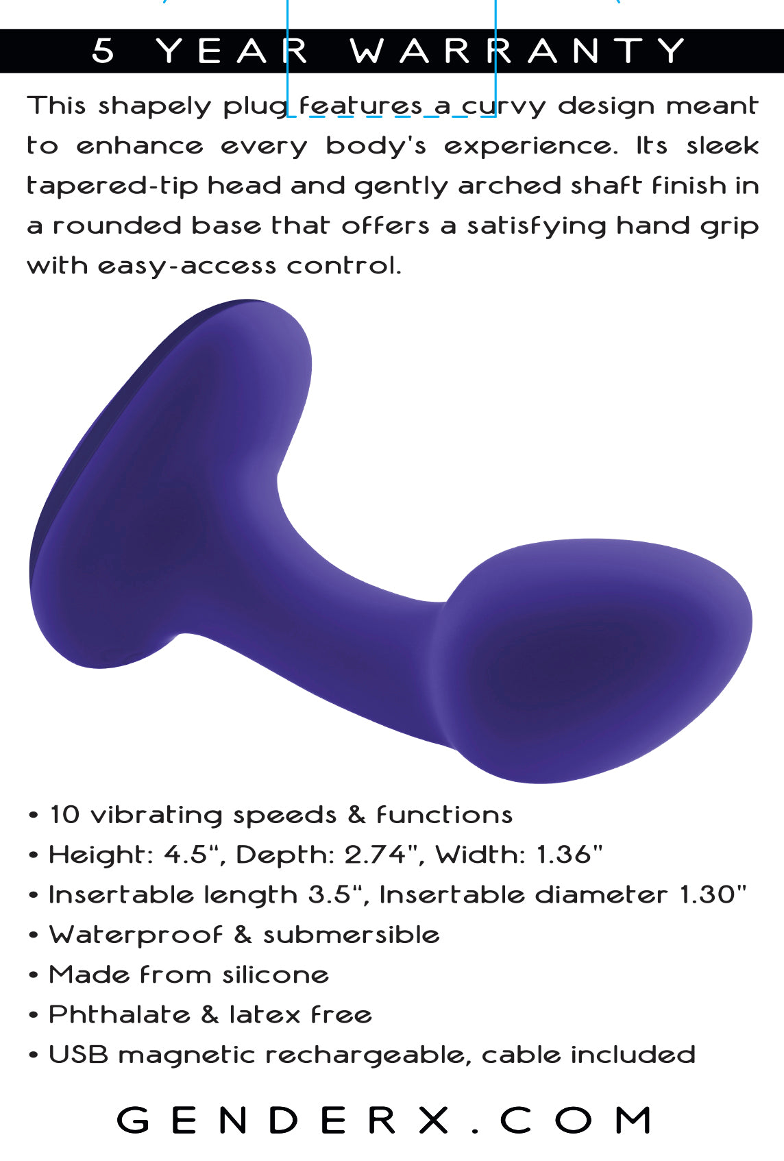 Features: 10 vibrating speeds and functions. Height 4.5 inches, Depth 2.74 inches, Width 1.36 inches. Insertable length 3.5 inches, Insertable diameter 1.30 inches. Waterproof and submersible. Made from Silicone and ABS Plastic. Made using phthalate free and latex free. USB Magnetic Rechargeable, Cable included. Categories: Anal Toys, Small, Medium Butt Plugs, Vibrators, Eco-Friendly Sex Toys, Rechargeable Vibrators. 2024.