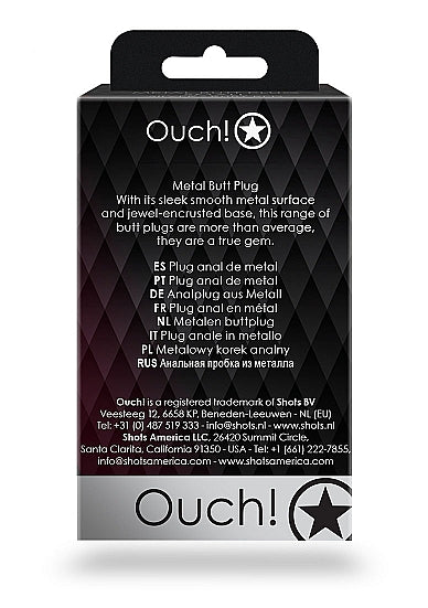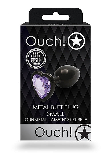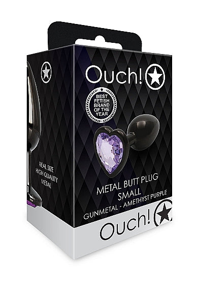 Ouch! Heart Gem Butt Plug Small Gunmetal Amethyst from Shots Toys. Best fetish brand of the year. With its sleek smooth metal surface and jewel encrusted base, this range of butt plugs are more than average, they are a true gem. Wear it just for yourself or while having fun with your partner, the tapered tip allows easier insertion while the flared base ensures piece of mind while in use. Enter a whole new world of sensations and stimulation, the world of temperature play combined with the beauty and pleasure of our Ouch! Aluminum Butt Plugs with Jewels. Dimensions package 1.97 inches by 1.57 inches by 3.15 inches. Weight Package 2.19 ounces.