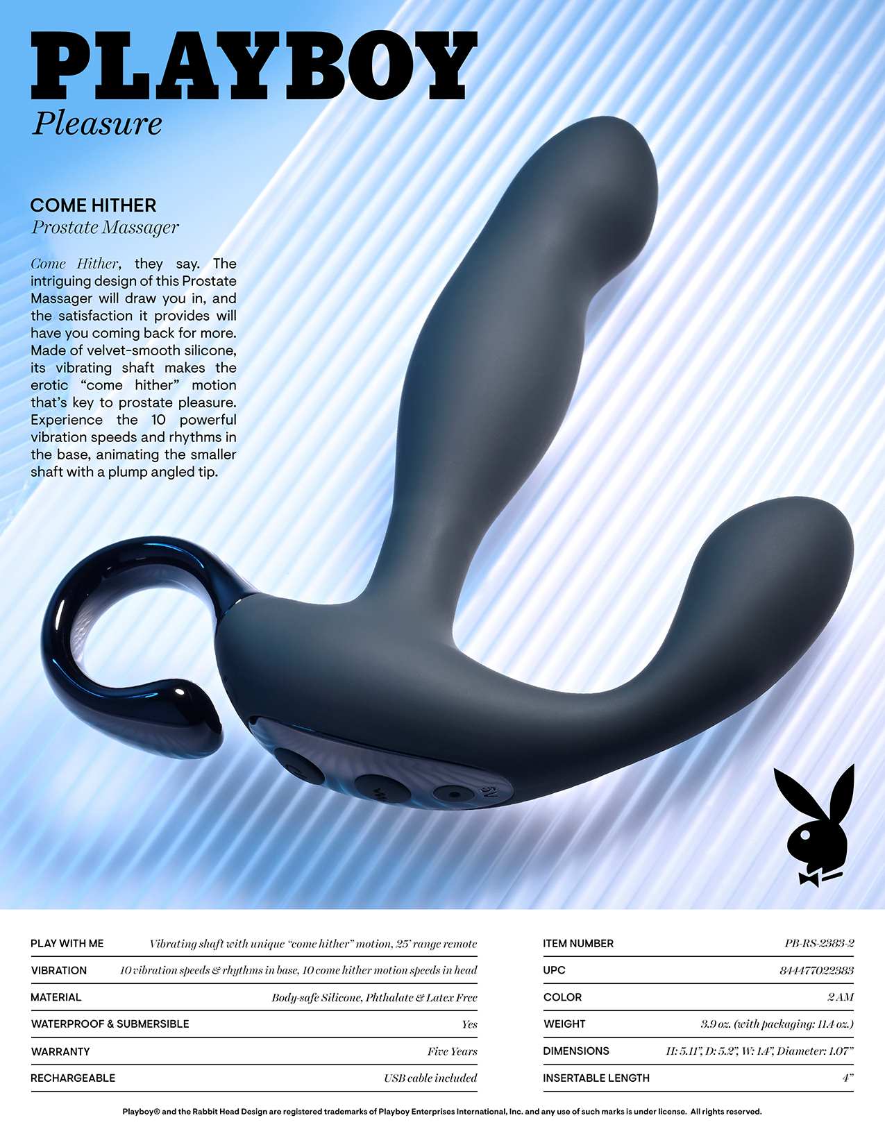 Specifications: vibrating Prostate shaft with unique Come Hither Motion. Materials: Body safe Silicone, Phthalate free, Latex free. Size: height 5.11 inches, depth 5.2 inches, width 1.4 inches. Insertion length 4 inches, diameter 1.07 inches. 10 vibration speeds and rhythms in base. 10 come hither motion speeds in head. Hold power button for 3 seconds to turn on/off. USB Rechargeable. Charging time 90 minutes. 60 minutes run time. Remote control included. 25 feet range. Remote control uses 1 CR 2032 battery. Waterproof vibrations. Submersible for easy cleaning and bathtub play. Care: always clean before and after use. Pat dry before storing. Only use a water based personal lubricant. 5 years manufacturer's warranty. Categories: Anal Toys, Prostate Massagers, P-Spot Stimulators, Vibrating Prostate Massagers, Vibrators, Sex Toys for Men, Rechargeable Vibrators. Play with me. Playboy and Rabbit Head design are registered trademarks of Playboy International. All rights reserved. 2023.