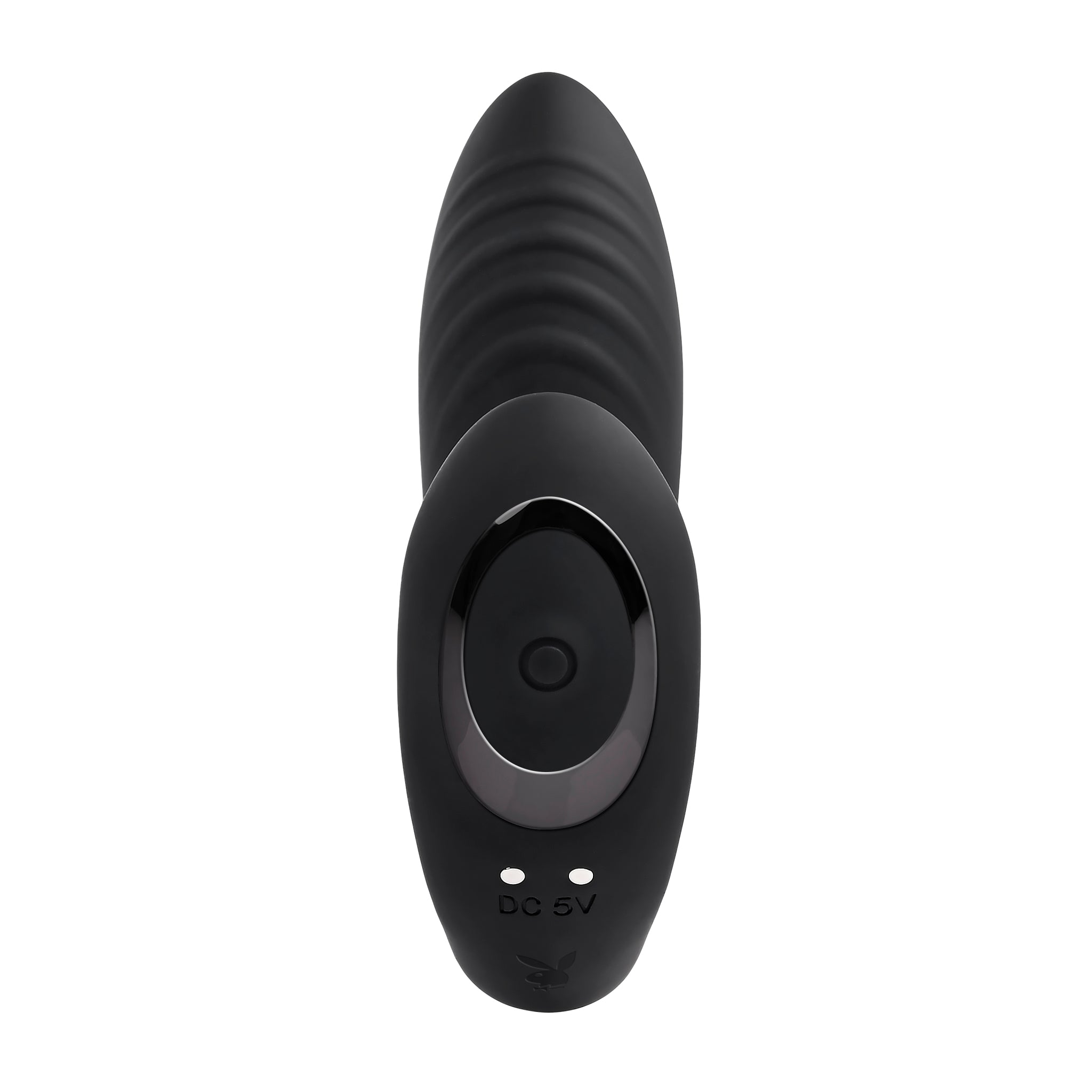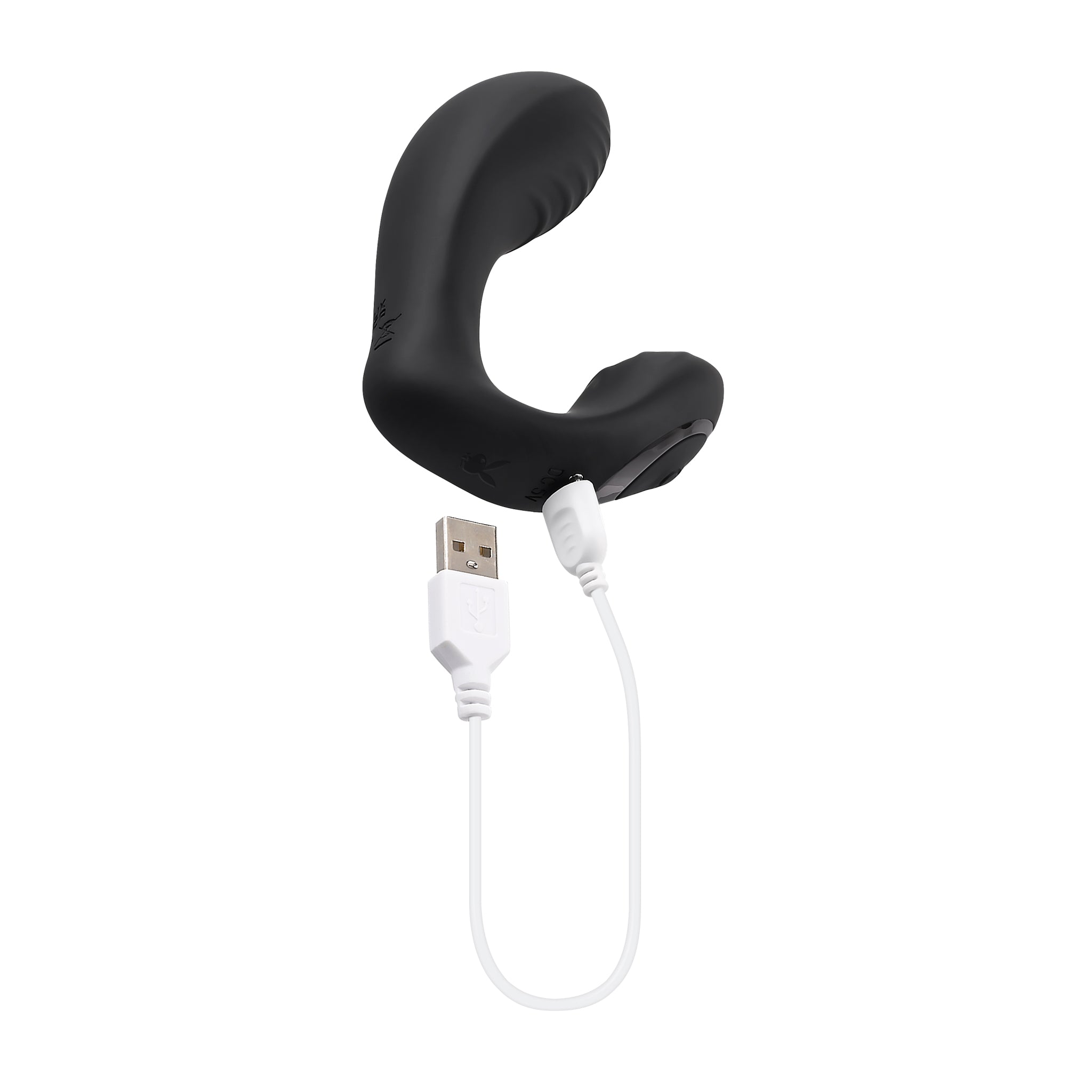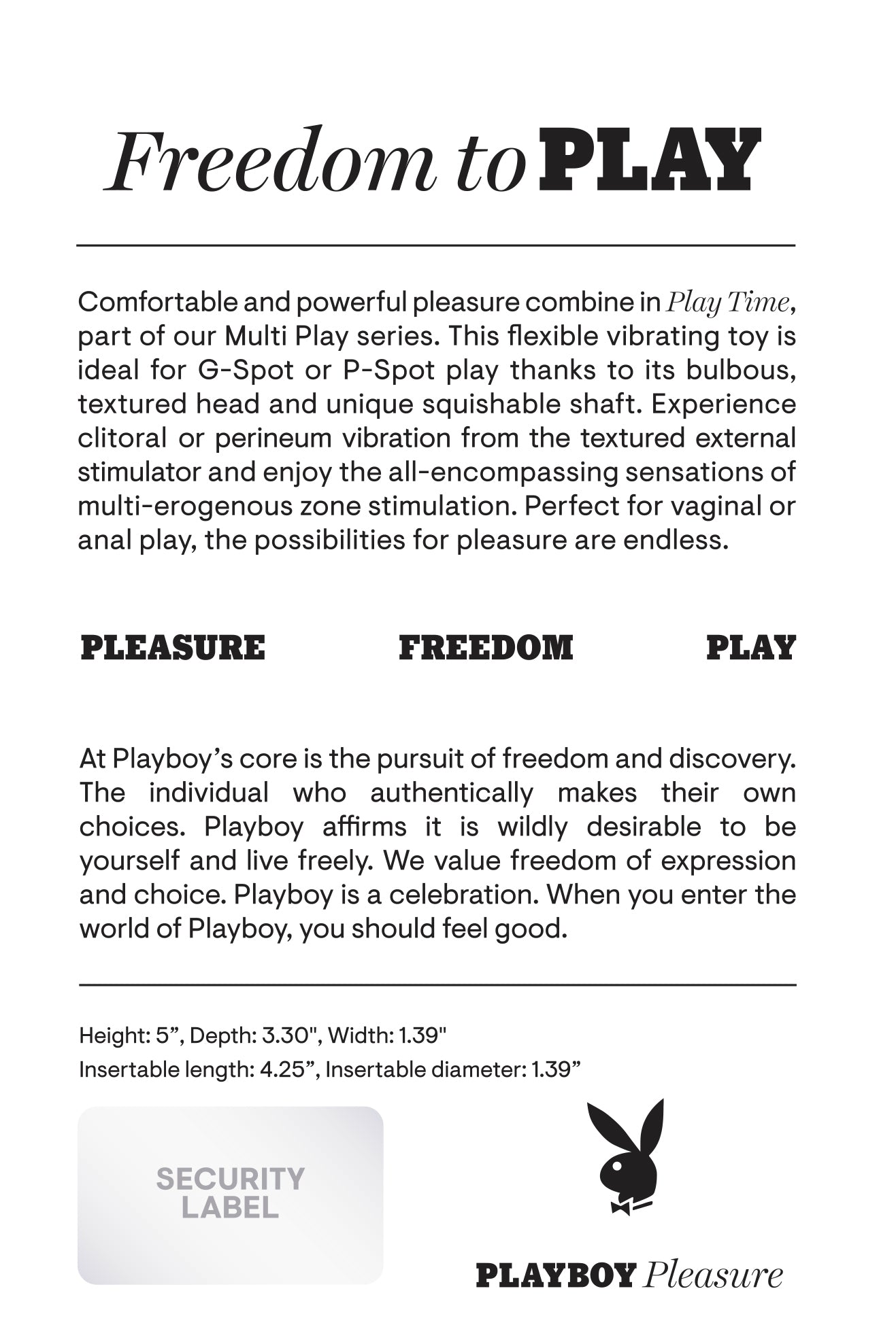 Playboy Pleasure Play Time Black Vibrator from Evolved Novelties. Sex, Love, passion. Freedom to Play. Comfortable and powerful pleasure combine in Play Time, part of our Multi Play series. This flexible vibrating toy is ideal for G-Spot or P-Spot play thanks to its bulbous, textured head and unique squishable shaft. Experience clitoral or perineum vibration from the textured external stimulator and enjoy the all encompassing sensations of multi-erogenous zone stimulation. Perfect for vaginal or anal play, the possibilities for pleasure are endless. Panel details: Play with me key feature: unique squishable material, vibrating 2 point stimulation. Vibration: 10 vibrating speeds and rhythms. Material: body safe Silicone, which is both phthalate free and latex free. Waterproof vibrations. 5 years warranty. Size specifications Height 5 inches, Depth 3.30 inches, Width 1.39 inches. Insertable length 4.25 inches, diameter 1.39 inches. Categories: Prostate Massagers, Vibrators, Eco-Friendly Sex Toys, Rechargeable Vibrators, G-Spot, Sex Toys for Couples, Men, Women. 2024.