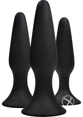 Three assorted sizes of firm, flexible and tapered plugs designed for effortless penetration. Velvety soft to the touch, these satin finish toys are easy to clean and safe to use with any lubricants. Each features a strong suction cup base for creative sexual fun.