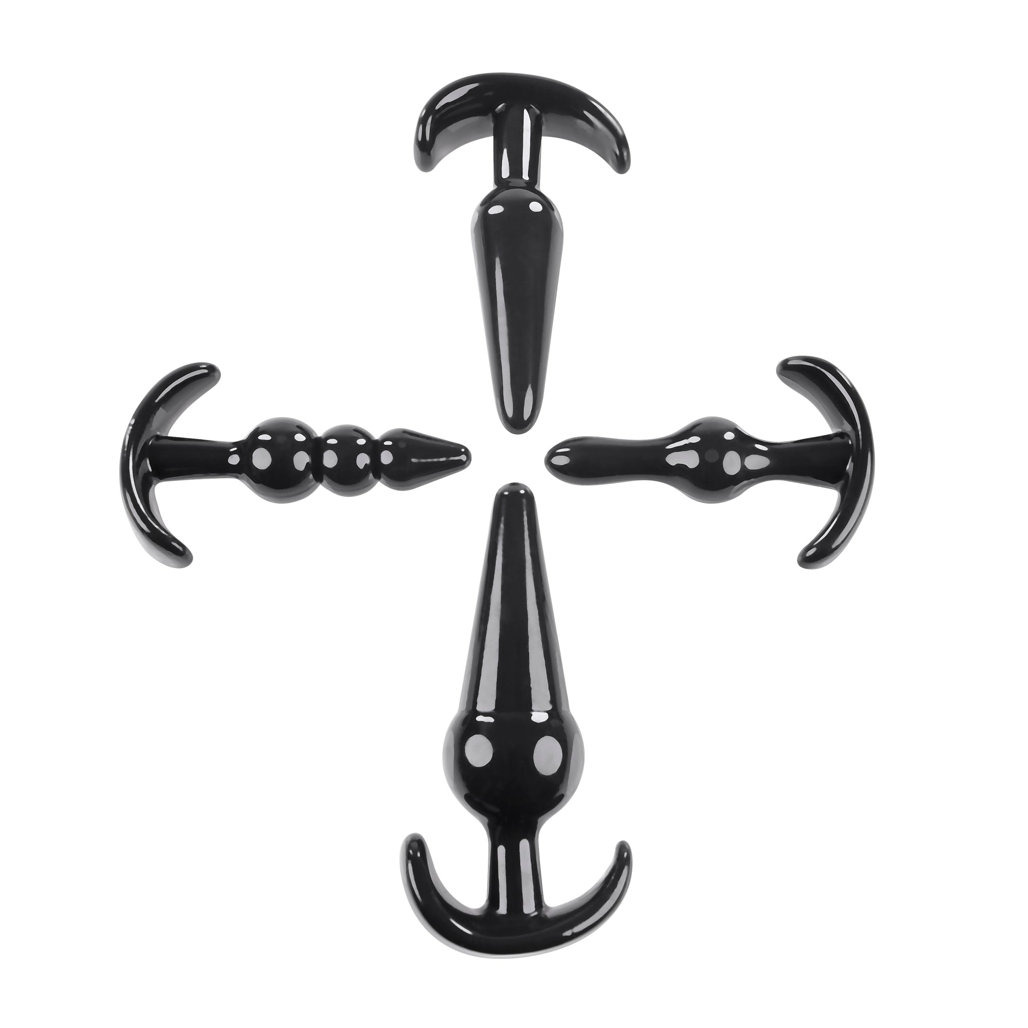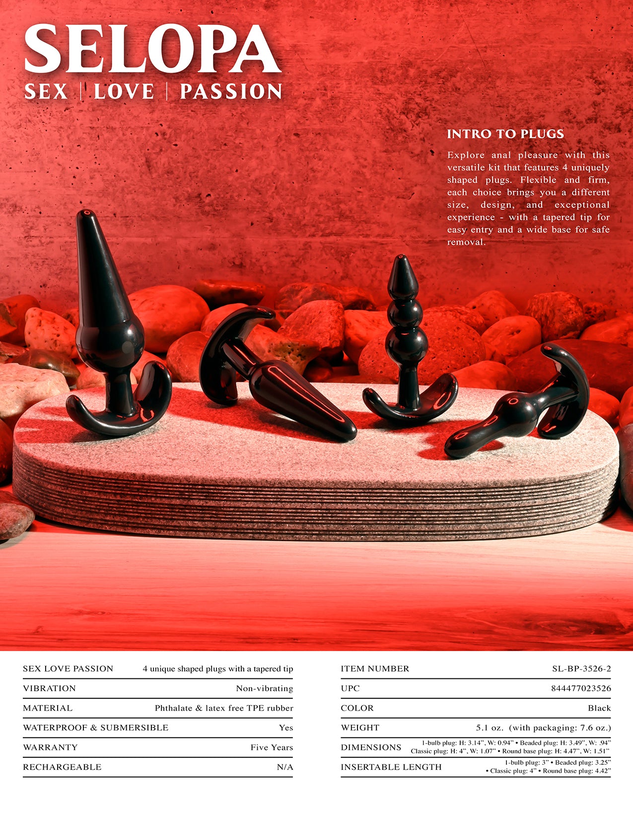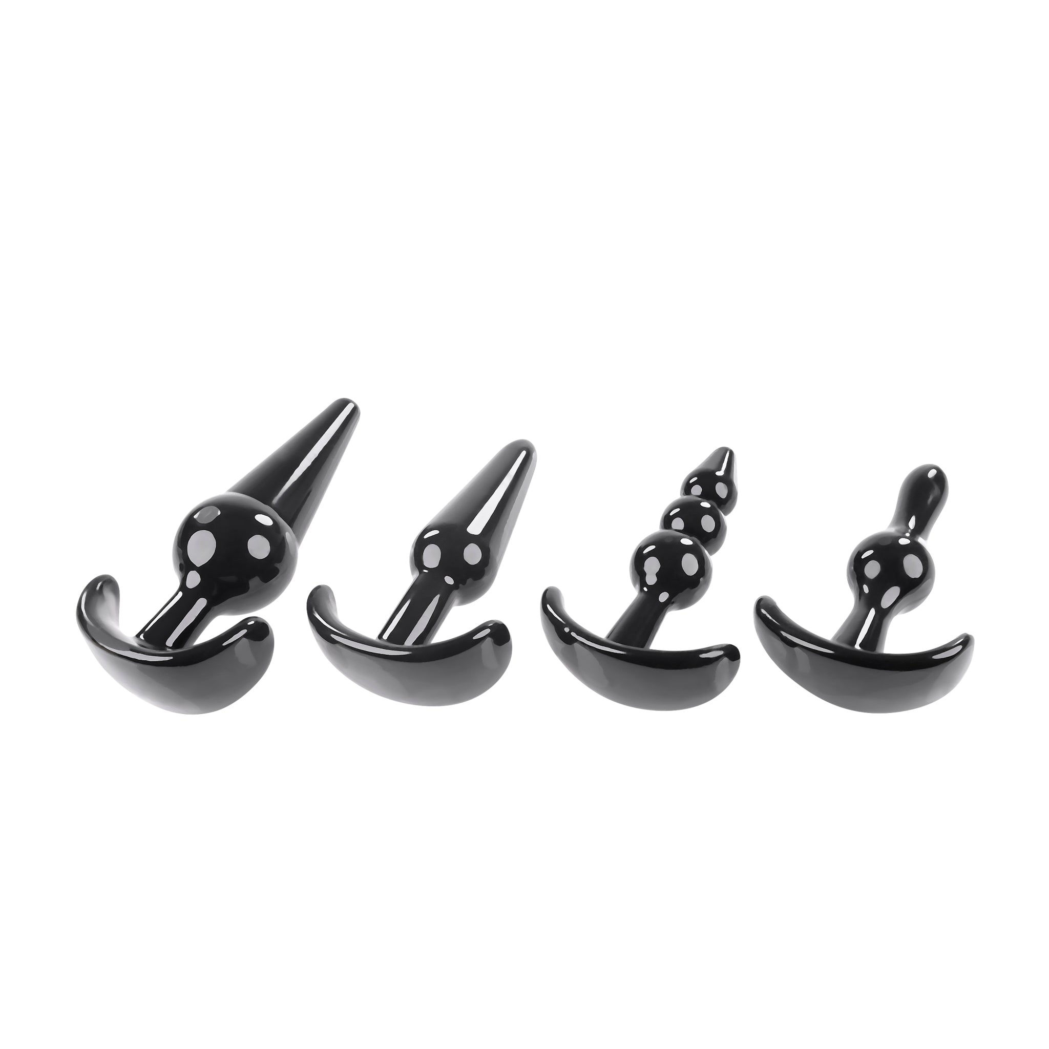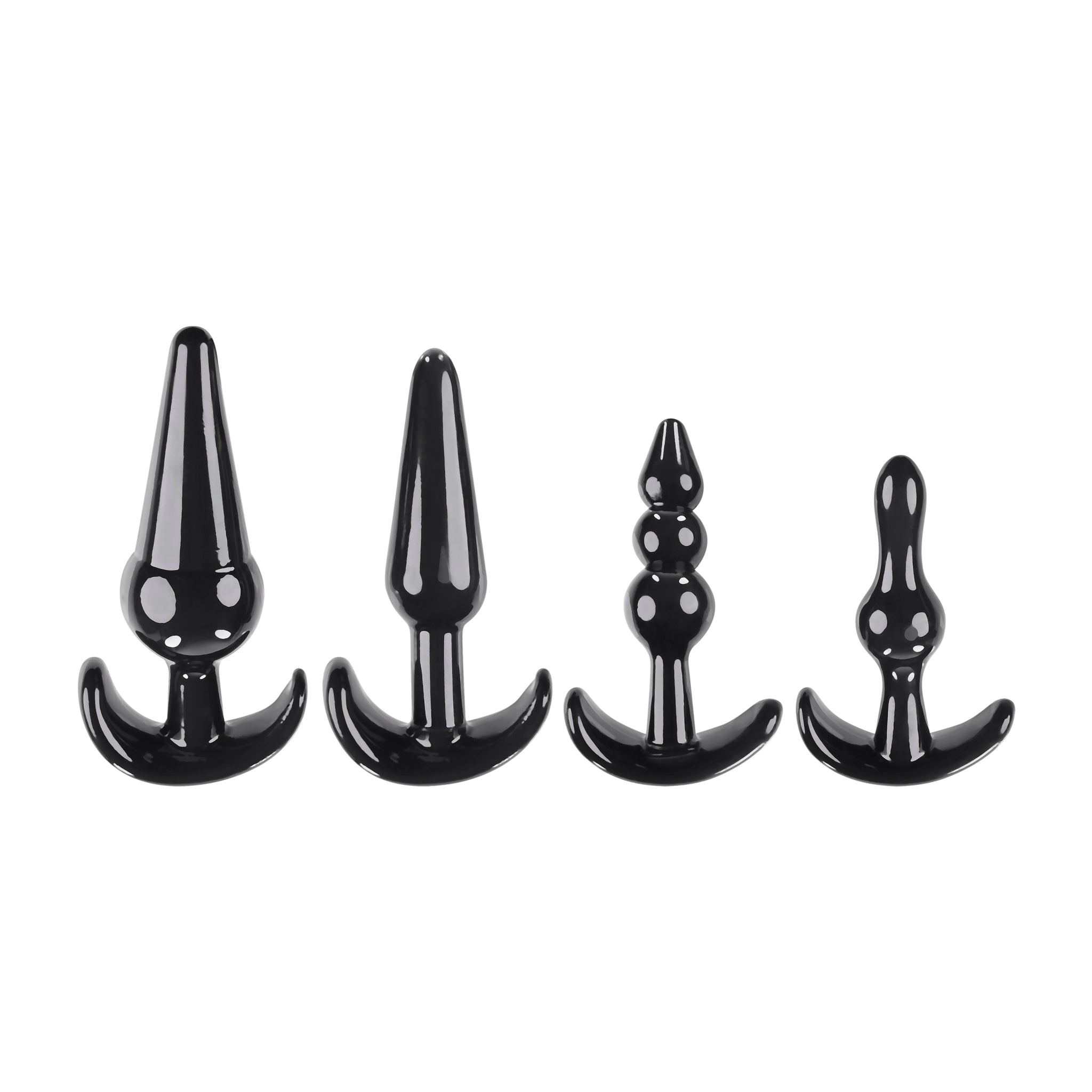 Selopa Intro To Plugs from Evolved Novelties. Love, sex, passion. Explore anal pleasure with this versatile kit that features 4 uniquely shaped plugs. Flexible and firm, each choice brings you a different size, design, and exceptional experience - with a tapered tip for easy entry and a wide base for safe removal. Intro To Plugs specifications: 1 Bulb Butt Plug 3.14 inches long, .94 inch wide. Beaded Butt Plug 3.49 inches long, .94 inch wide. Classic Butt Plug 4 inches long, 1.07 inches wide. Round Base Butt Plug 4.47 inches long, 1.51 inches wide. Made from phthalate free and latex free Thermoplastic Elastomers TPE. Waterproof, non-vibrating Butt Plugs and submersible. Each Butt Plug features an anchor T-base. This helps to keep the Butt Plug from getting lost up there. Always clean before and after use. Plus between partners. Use a water based personal lubricant. Do not use oil base personal lubricants. These can corrode the toys materials. Care: clean product with toy cleaner or soap and water. Followed by a warm water rinse. Pat dry before storing. Categories: Anal Toys, Sex Toys for Couples, Men, Women, Sensual Kits, Anal Trainer Kits, Anchor Ends, T-Plugs, Flexible Butt Plugs. 2023.