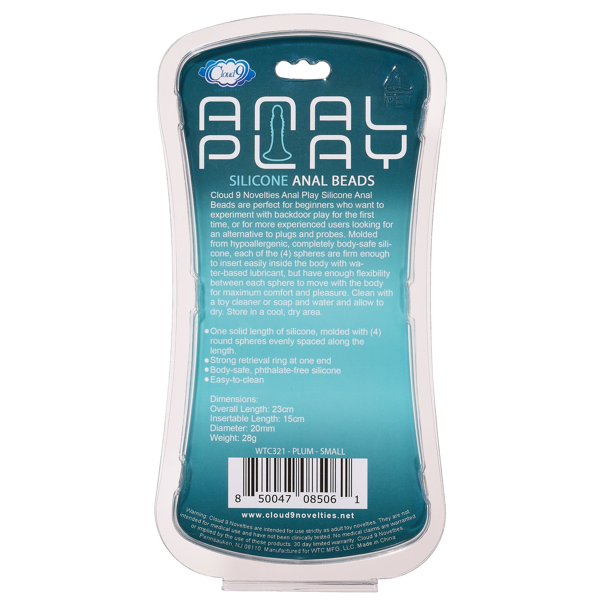 Cloud 9 Novelties Anal Play Silicone Anal Beads are perfect for beginners who want to experiment with backdoor play for the first time, or for more experienced users looking for an alternative to plugs and probes. Molded from hypoallergenic, completely body safe Silicone, each of the 4 spheres are firm enough to insert easily inside the body with water based lubricant, but have enough flexibility between each sphere to move with the body for maximum comfort and pleasure. Clean with a toy cleaner or soap and water and allow to dry. Store in a cool, dry area.