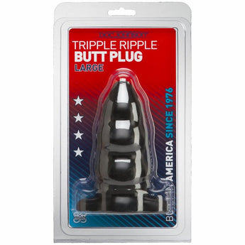 Triple Ripple Butt Plug Large Black from Doc Johnson Novelties the largest in 3 steps to anal satisfaction! Satisfy your desire for anal adventures with the 5 inches Large Triple Ripple Butt Plug. This thick Butt Plug has a unique shape that starts off petite at the head then gradually widens and tapers into 3 big bumps for tons of sensation during insertion and removal. The wide base makes it safe, and compatible with an O-ring type harness. As with any anal toy, you'll want to use lots of lube. A clever addition to your toolbox, Doc Johnson's Triple Ripple is a large size, graduated butt plug with three stages of bliss. As the shaft widens, each level gives a fuller and more stretched sensation. It is made from non-phthalate body safe material, which includes Doc's anti-bacterial Sil-A-Gel formula. Each level is a new challenge. There are three levels of pleasures. Water-based formulas works best with our rubber material. Made using phthalate free, non-toxic materials: Sil-A-Gel, PVC. All new formula is antibacterial, non-toxic formula. Latex free, Cadmium free. Odorless. One size fits most. Butt plug measures 5 inches to 6 inches long by 2 inches to 2.5 inches wide. Safe for Anal, Vaginal, G-Spot and Prostate massage. Categories: Anal Toys, Prostate Massagers, Probes, Sticks, Rods, Sex Toys for Couples, Men, Women, Large, Huge Butt Plugs. Triple Ripple Butt Plug Large Black from Doc Johnson Novelties the Great American Toy Company. Made in the USA. 2024.