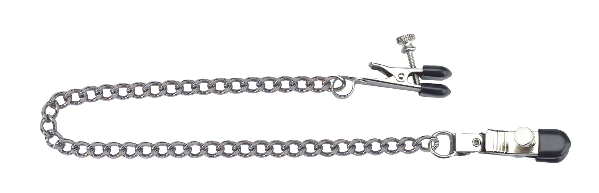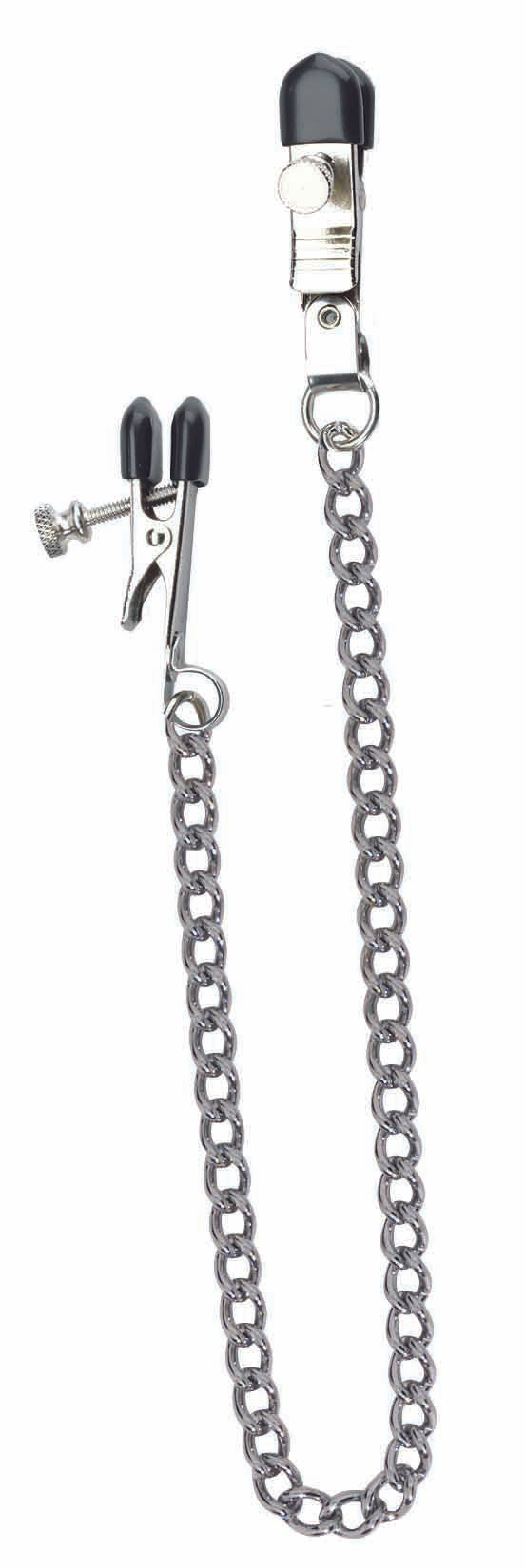 Adjustable Broad Tip Clamps with Loop Link Chain. Adjustable deluxe wide alligator nipple clamps are great for large nipples that need a wider than usual tip. The wide, rubber-tipped tips distribute the pressure from the clamp, making them good for somewhat gentler play. But don't be fooled the thumbscrews can adjust the clamps to a very strong grip. These nipple clamps feature a fine silky, jewel chain. Adjustable nipple clamps. Non-piercing nipple clamps with broad ends tipped in black rubber for comfort. Spartacus A Passion for Quality Catalog page 7.