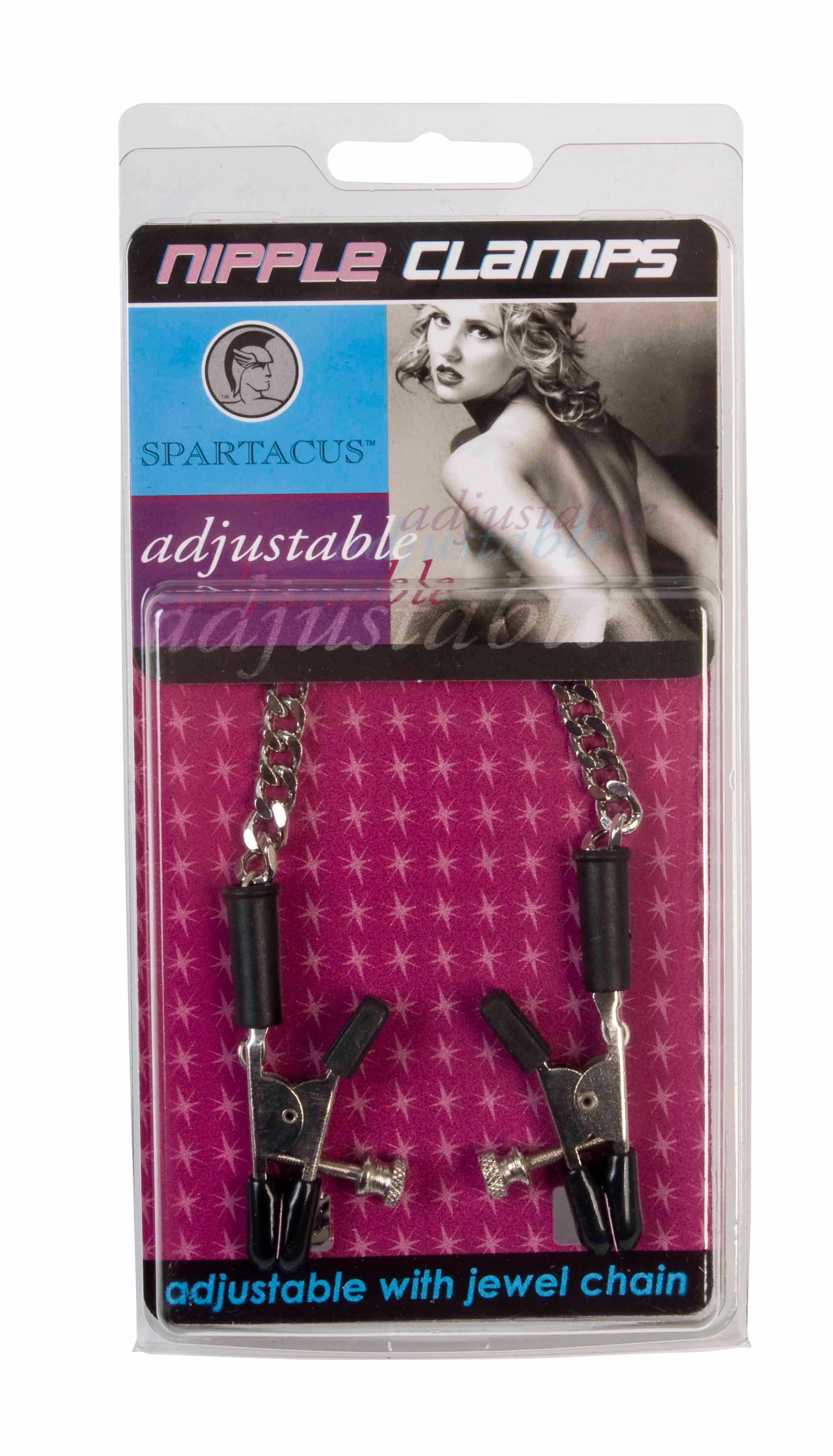 Spartacus gator nipple clamps deliver a tantalizing pinch that you will definitely notice. The skinny tips deliver localized pressure as lightly or as tightly as you choose. Alligator Nipple Clamps with wide alligator ends and a jewel chain are great for large nipples that need a wider than usual tip. The wide, rubber-tipped tips distribute the pressure from the clamp, making them good for somewhat gentler play. But don't be fooled the thumbscrews can adjust the clamps to a very strong grip. Nipple clamps and jewel chain provide a classic fetish look. Non-piercing nipple clamps with broad ends tipped in black rubber for comfort. Spartacus A Passion for Quality Catalog page 6. New images added February 10, 2013. -old