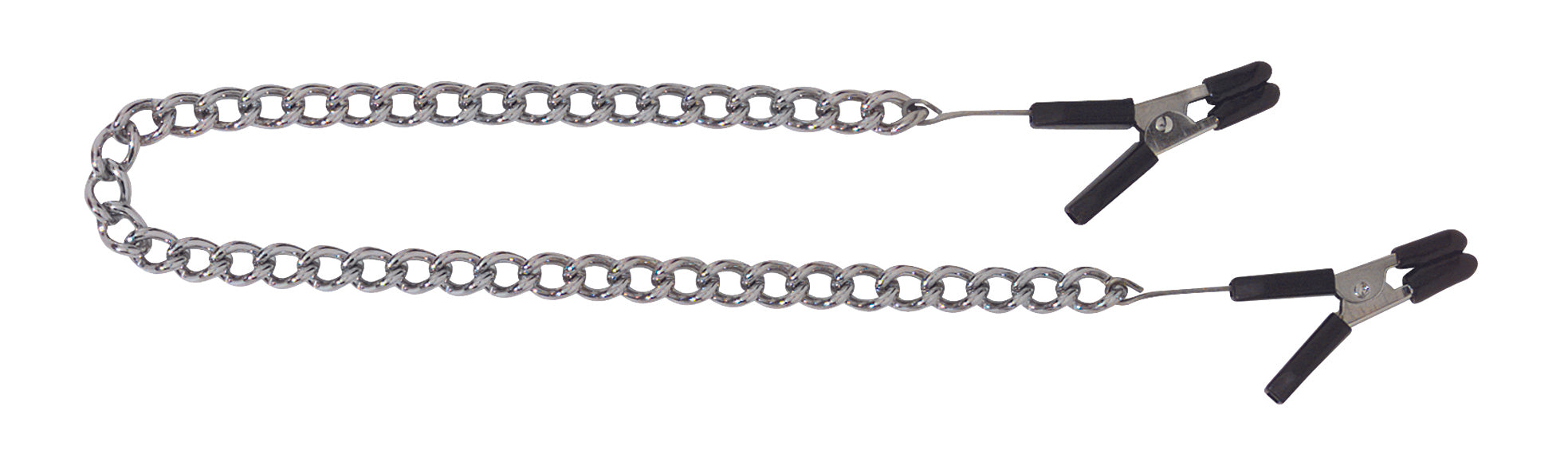Endurance Jumper Cable Clamps Link Chain. Light weight rubber-tipped jumper cable clamp style nipple clamps. Their small surface area gives them some real pinch. Endurance nipple clamps offer maximum pressure, for an intense and localized experience. These endurance clamps feature a sturdy, durable link chain. Nipple clamps and link chain provide a classic fetish look. Non-piercing nipple clamps with jumper cable ends tipped in black rubber for comfort. Spartacus A Passion for Quality Catalog page 11.