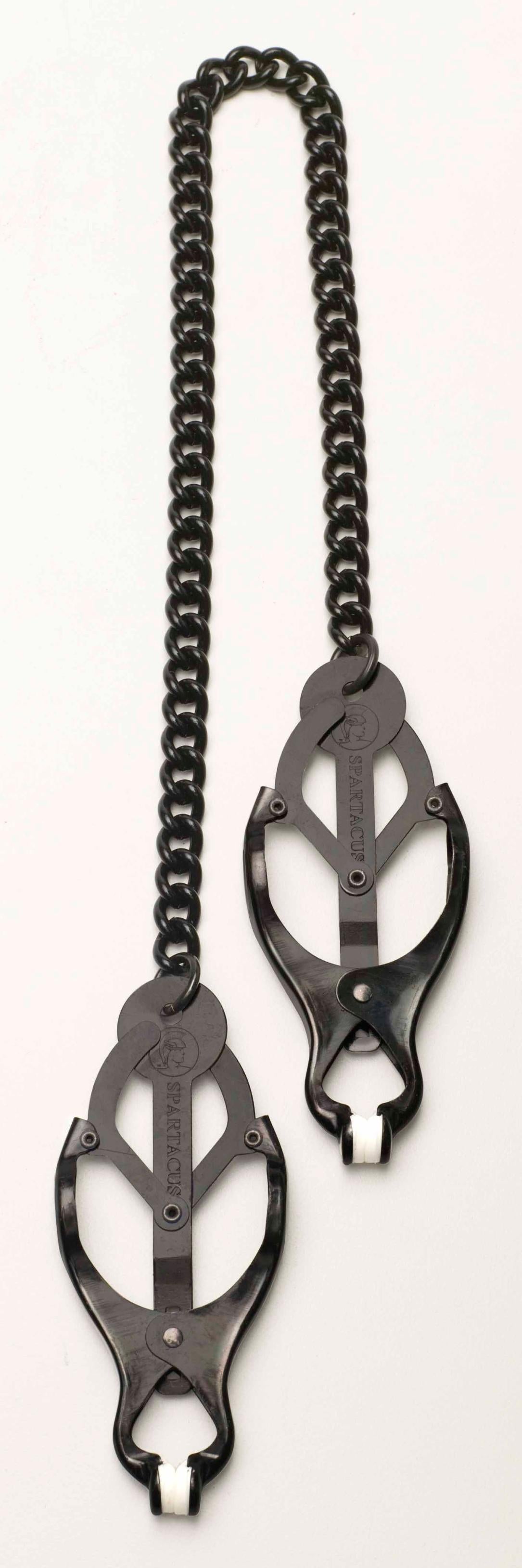 Blackline Endurance Butterfly Clamps Link Chain. Endurance nipple clamps with link chain offer maximum pressure for an intense and localized experience. These endurance nipple clamps feature a sturdy, durable link chain. Non-piercing body jewelry. Nipple clamps can be applied to the nipples of either men or women. They create pain/pleasure by restricting blood flow from erect nipples by applying pressure to them. Most nipple clamps are adjustable allowing the user to determine the amount of pressure. For first timers please check every 15 minutes to ensure bruising to delicate tissue does not occur. To turn up the volume use a nipple sensitizers like Body Action. Spartacus A Passion for Quality Catalog. Categories: Bondage, Fetish, Kink, Nipple Play, Pasties, Accessories, Bondage Kits, Kinky Sets. 2022.