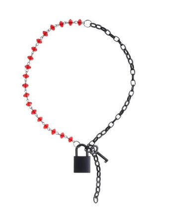 Features: Designed for discreet wear with stunning red gems and black chain Custom black lock and key keeps collar in place Wear tightly or loose with an adjustable length from 9" to 20"