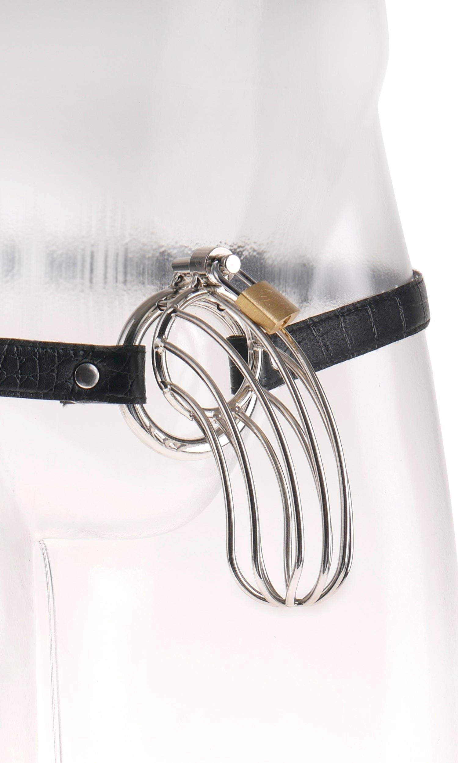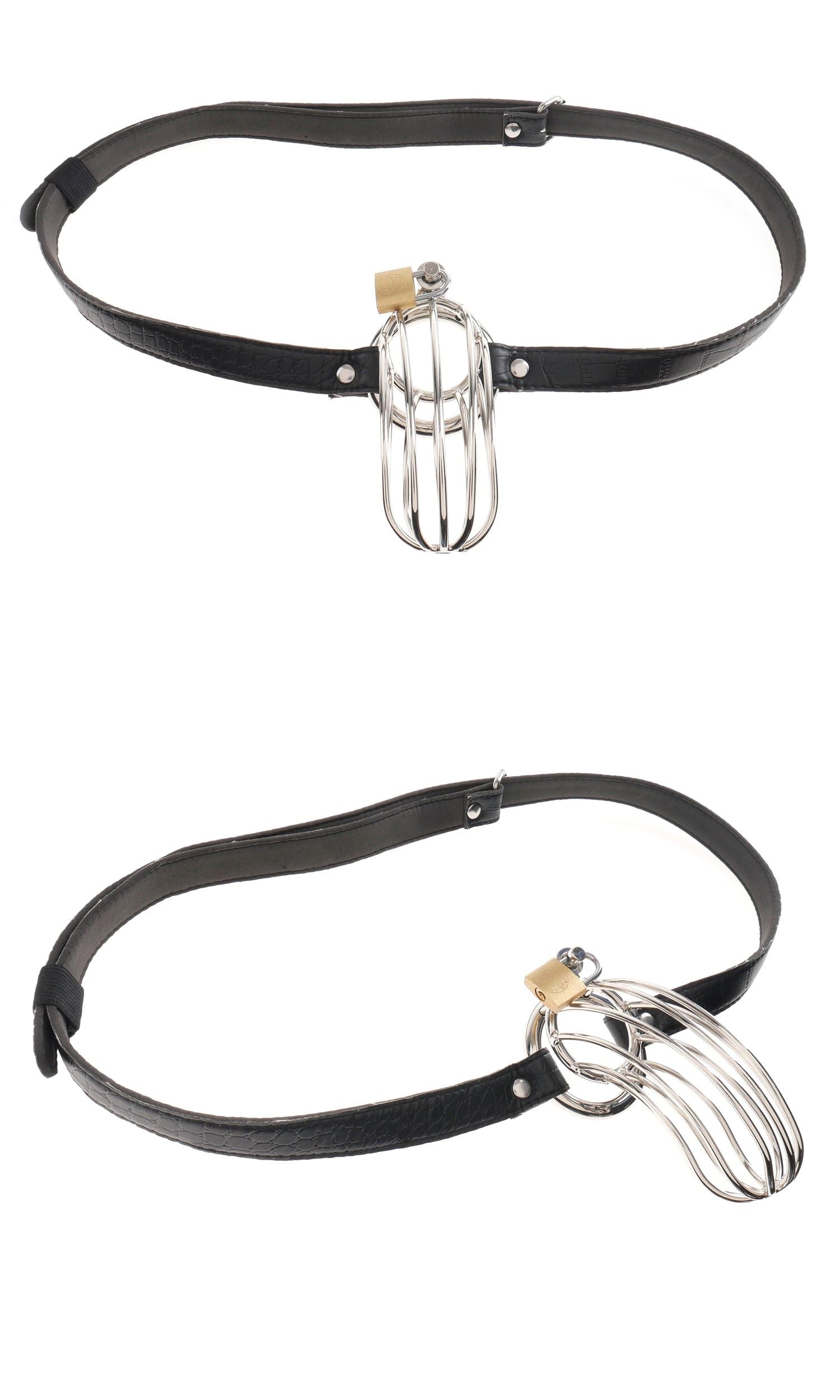 Fetish Fantasy Extreme The Prisoner Black Steel Cock Cage Male Chasity with Lock. Put his boner behind bars with this chastity belt cock cage! Punish your subject's misbehaved member with The Prisoner steel cock cage chastity belt. Made from highly polished steel and secured with lock and key, this shiny chrome chastity cage will keep your sub's cock behind bars until you decide to set it free. Dare your subject to get a hard on and watch as they struggle inside the prison like confines of the cage. No matter how aroused he gets, the curved steel shape prevents your sub from getting erect, but the open design still allows them the freedom to piss when they need to. You hold the key to pleasure, so make sure they do as you say before you grant them their freedom. The designer alligator style waist strap easily adjusts to fit most sizes and feels great against your skin. Make sure your subject is flaccid before trying to fit his cock into the cage and use plenty of Moist lube to make insertion easy and painless. Attach a leash to the waist strap and explore all your master and slave role playing fuck fantasies! Package depth 3 inches, width 5.5 inches, height 10.75 inches. Package shipping weight 10.60 ounces. Package includes 1 Waist Belt, 1 Steel Cage, 1 Lock, 3 Keys. Package type Box. Materials: Cage Steel, Strap Vinyl. Country of origin China. 90 days warranty. Pipedream Products Catalog - Fetish Fantasy Extreme. Categories: Bondage, Fetish, Kink, Men's Cock & Ball Gear, Body Harnesses, Sex Toys for Men. 2022.