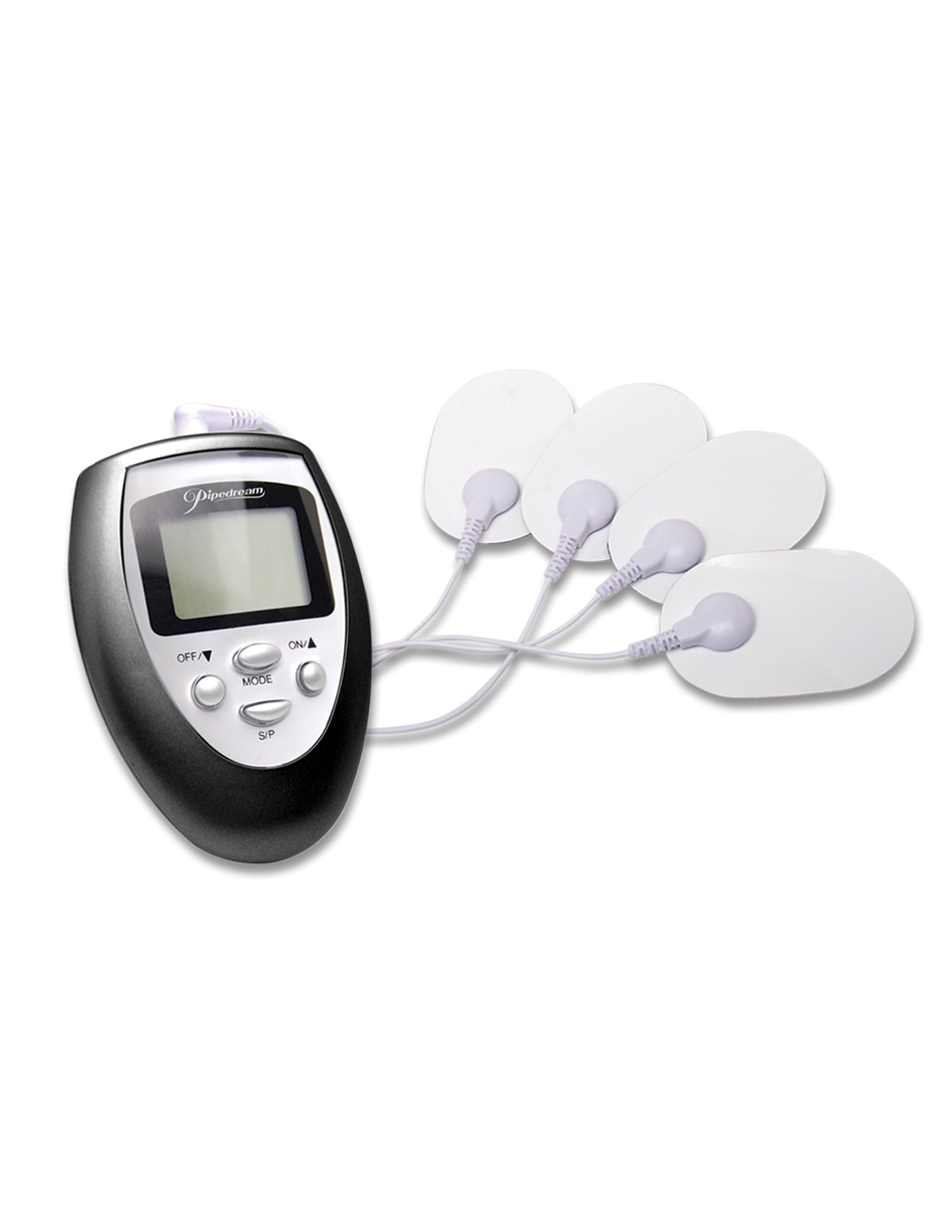 Fetish Fantasy Series Shock Therapy from Pipedream Products. Give your sex life a charge with this incredible beginner's electro sex kit. This electric stimulation Shock Therapy kit is perfect for first timers and those new to e-stimulation. The easy to read LCD screen on the digital power control unit clearly displays the function and intensity level, and with 3 pre-programmed pulsation patterns to choose from, this attractive control unit sends electrical impulses to whichever body part you place the pad on. Choose from a sensuous tingle to a throbbing tap, all with the push of a button, and pick one of the 5 body zones to stimulate. With over 100 stimulation combinations to choose from, the possibilities are endless. Using the timer function, you can select the time of use and the battery powered unit will automatically shut off after the interval. The pads are self adhesive, attach to the lead wire using snaps, and clean up easily after the fun with Pipedream Toy Cleaner and warm water. Great for muscle stimulation, neural stimulation, and an all over relaxing electro massage! Modulation frequency: 0.01Hz to 1Hz, pulse repetition frequency: less than 70Hz, output pulse amplitude: 70-120Hz.