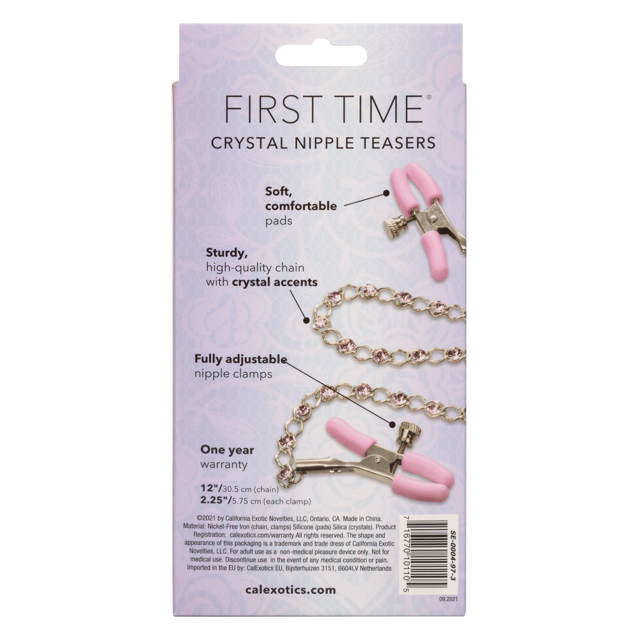 First Time Crystal Nipple Teasers Pleasure Toys from California Exotic Novelties. Push sensation to the next level and enjoy teasing nipple play with the First Time Crystal Nipple Teasers. Explore elevated sensation with the 2 fully adjustable Nipple Clamps, teasing chain and sparkling crystals. Reach new levels of playful pleasure with the adjustable nipple clamps. Clamp the naughty clasps to your body and enjoy every rush of pain and pleasure. The teasing clamp has adjustable tension to stimulate anywhere on your body for playful teasing. As the tension tightens, the tingles intensify with every turn of the dial for the ultimate in nipple stimulation toys. With the teasing clamp stimulation and increased blood circulation, you can look forward to amplifying nipple sensitivity and intensify overall arousal. These easy to use nipple teasers are great for him or her. The two adjustable nipple clamps are made from Nickel free Iron with Silicone cote and Nickel free Iron chain and Silica crystals. Cal Exotics - First Time. SKU SE-0004-97-3. Color Pink. 1 year warranty. Material type Iron, Silicone.