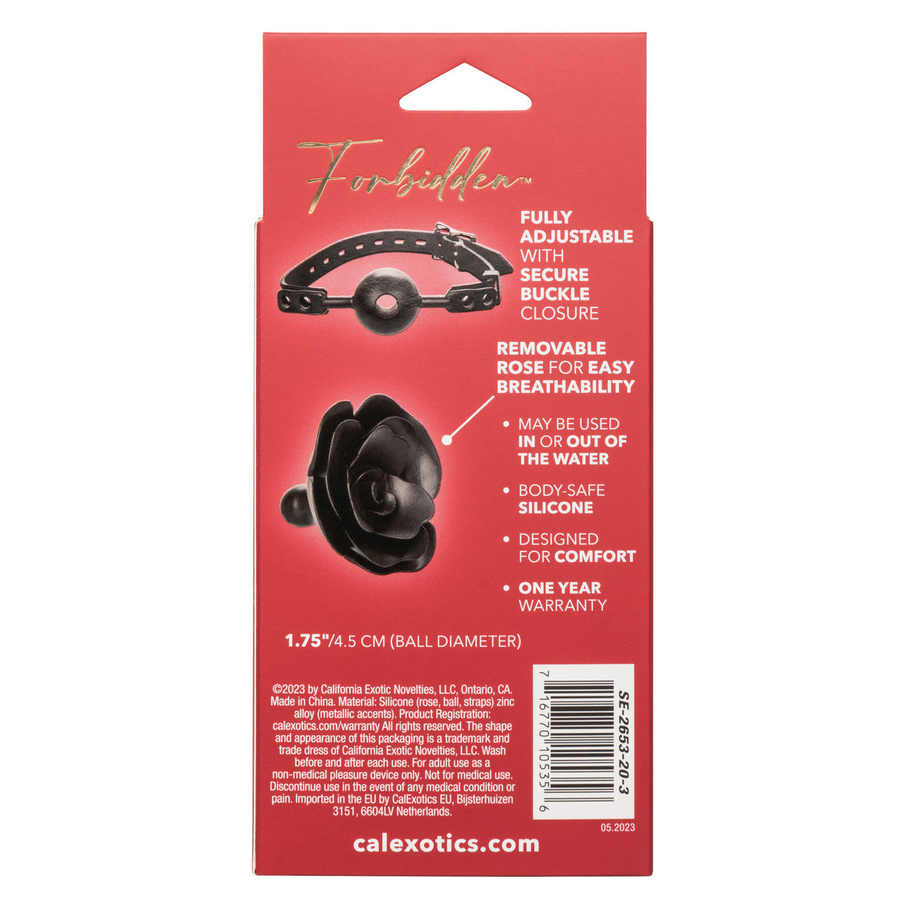 Features: Wearable, Phthalate free, Adjustable. Waterproof. Material type: Silicone Rose, Ball Gag, Straps. Zinc Alloy Metal accents. Measurements: 1.75 inches diameter of ball. Bulk weight 4.6 ounces. Package: 7 ounces. Package: 3 inches by 3.15 inches by 6.75 inches. Categories: Sexy Costume Accessories, Bondage, Fetish, Kink, Bondage Restraints, Naughty Role Play, Gags, Muzzles. 2024.