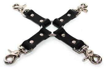 Bondage Basics Leather Collection Leather Hog Tie is available in two colors: Red and Black. Each sold separately. Hog tie is a classic way to restrain your lover. A great bondage shortcut, the hogtie restraint enables the dominant to quickly put the willing submissive at their mercy by affixing two ankle cuffs to two wrist cuffs. Made of real leather, this durable bondage tool features four thick leather straps permanently to a central O ring with silver tone studs. Each strap ends in a snap hook, which can be easily attached and unattached with one hand to keep the scene flowing smoothly. Hog ties can be used behind the back or in front of the submissive. Contains: 1 Leather Hog Tie, cuffs sold separately. Sturdy, thick leather with 4 rotatable crab-claw hooks. 11" from tip to tip. Color: Black Type: Hog Tie, Bondage Accessory. Material: Leather Length: 3 inches each connector. 19