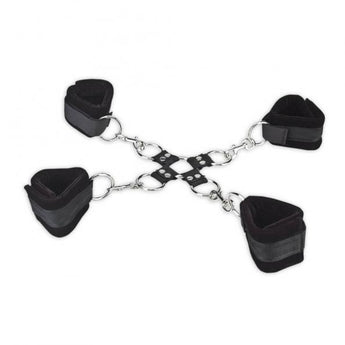 The Lux Fetish 5 Piece Hogtie Set is a couples dream! Perfect for BDSM beginners and intermediate players, the 5 Piece Hogtie Set allows easy and comfortable restraint. Take full control of your partner while he or she is secured in positions that you never thought possible. Erotic play will never be the same again! Put your partner in a vulnerable position with hogtied hands and feet or detach the cuffs by unhooking the D-rings and attaching to other restraint systems. The Lux Fetish 5 Piece Hogtie Set features four adjustable cuffs attached to a four way central O-ring. Strap your lover’s hands and feet into the soft, velvet lined cuffs that secure with Velcro straps and attach the D-rings to the center O-ring to restrict their limbs to the back of their body, leaving them ready for complete submission. The velvet lined cuffs feel soft against the skin and sensually caress the body, stimulating the senses.