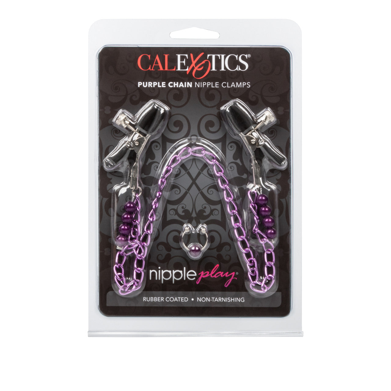 Features: Wearable, Phthalate free Material type: Aluminum Chain, Nickel free Iron Clamps, Ring, Phthalate free PVC Pads, ABS Plastic Bead. Measurements: 2 inches each Nipple Clamp. 16 inches Chain. 1 inch diameter Ring. Bulk weight 1.5 ounces. Package: 2.8 ounces. Package: 0.75 inch by 5.5 inches by 8.25 inches. For Women, Attire, Adornments, Jewelry. Categories: Bondage, Fetish, Kink, Nipple Play, Sex Toys for Women, Body Jewelry, Bondage Kits, Kinky Sets. Nipple Clamps Purple Chain with Navel Ring is a registered trademark for California Exotic Novelties. Sex toys and sexual wellness. 2023.