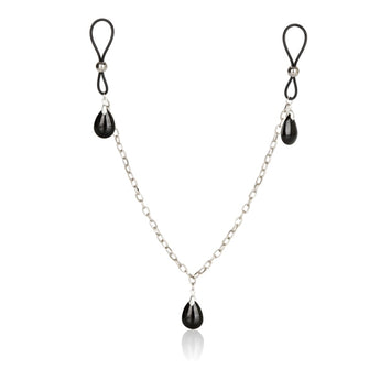 Nipple Play Non Piercing Nipple Chain Jewelry Onyx from California Exotic Novelties.The easy to wear, cinch design Nipple Play Non-Piercing Nipple Chain Jewelry is designed with your ultimate pleasure in mind. The seductive body jewelry shows off your intimate pleasure zones to maximum effect. Slip on the fully adjustable nipple adornment and enjoy tingling sensations, as the jewelry sways and stimulates the nipples. The set comprises of 2 adjustable nipple loops that are made from soft and super stretchy Silicone. The cinch design loops measure 2.5 inches and have Silver beaded adjusters that slide up and down, for an easy secure nipple grip. From the loops dangles a non-tarnishing, Nickel free Iron Chain that is decorated with a trio of teardrop shaped Onyx Crystals. The Nipple Jewelry can be worn as a statement fetish piece, or to tantalize and seduce your lover. The comfortable to wear jewelry is perfect for first time and experienced users. The sensual sparkling body jewelry is easy to wear and stimulates nipple sensitivity and intimate arousal. For an intensified erotic experience, use arousal gel for a long lasting erect nipple effect. Before and after use, clean the jewelry with a toy cleaner spray. Includes 2 fully adjustable nipple adornments. Soft and comfortable cinch design. Sturdy high quality chain for added sensuality. Non piercing, non tarnishing, nickel free. Safe and pure for body and pleasure made using phthalate free materials Nickel free Iron chain, beads, Silicone Loops, Crystal jewels. 2.5 inches each loop. 17 inches overall length. Bulk weight 0.7ounce.