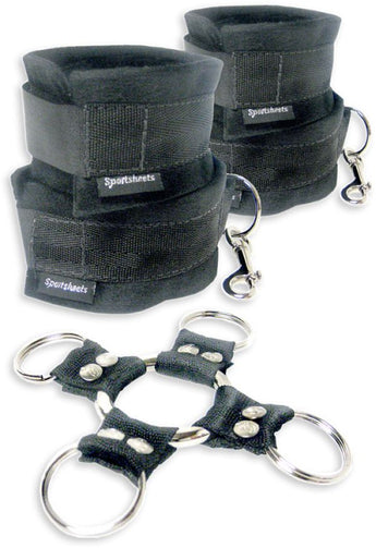 5 Piece Hog Tie and Cuffs Set from Sporsheets. A timeless bondage classic. Four adjustable cuffs clip around a heavy duty metal o-ring. Comfortable cuffs adjust for easy on and easy off with Velcro closures. Sportsheets the classic bondage position. 5 Piece Hog Tie Set is a best seller for many reasons, first it works. Hardly any assembly required. Easy to use, comfortable to wear There is no better way to restrain your partner! Outstanding adult fun. 4 adjustable cuffs wrap comfortably around the wrists and ankles. Hooks easily attach to the center ring for a quick and easy way to secure your partner. No bondage experience required to use this device the 5 piece hog tie set! Category: Restraint, Roleplay, Restraint Play. Classic bondage restraint works great as a sex position device. Details: what can your partner do to you when your hands are tied to your legs behind your back? Anything they want.