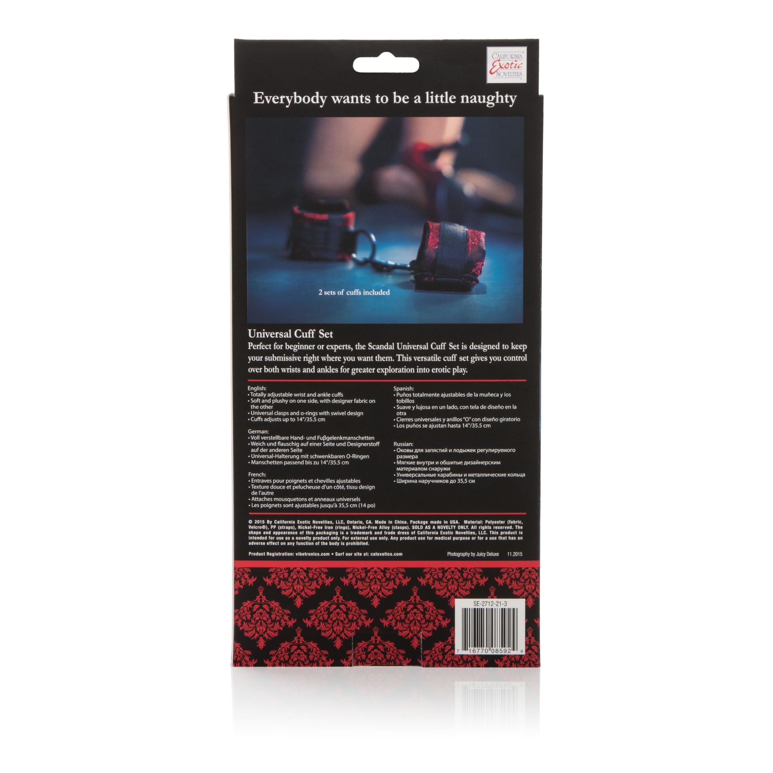Perfect for beginner or experts, the Scandal Universal Cuff Set is designed to keep your submissive right where you want them. This versatile cuff set gives you control over both wrists and ankles for greater exploration into erotic play.