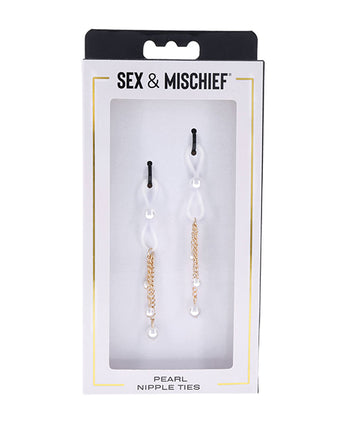 Sex and Mischief Pearl Nipple Ties from Sportsheets. Indulge in the refined allure of our Pearl Nipple Ties a captivating accessory that adds a touch of sophistication to any naughty occasion. With the pearls suspended by clear ties, they appear to effortlessly float on the body, creating a mesmerizing and ethereal effect. Let the Pearl Nipple Ties adorn your body like precious jewels and easily adjust the ties to add pressure and a touch of luxury and allure to your most cherished moments.