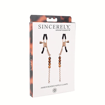 Sincerely Amber Beaded Nipple Jewelry from Sportsheets. Adorn your chest in exquisite tortoise shell inspired Amber Beaded Nipple Jewelry and add the teasing torment of nipple play to your next ravishing rendezvous. Made with tension adjustments, choose the intensity you or your partner desire. 1 pair of nipple clamps. 5 inches by 1 inch nipple jewelry with Thermoplastic Rubber TPR clamps and drop of 3 Acrylic beads, 1.7 inches long chains, light gold plating, Alligator ends. Rubber tipped nipple clamps with tension adjustments. Beaded chains for tugging and pulling. Gold plated chain with stands wear for added durability. Materials: Iron, Acrylic, TPR. Lifetime Warranty. Categories: Bondage, Fetish, Kink, Sex Toys for Couples, Nipple Play, Sex Toys for Women, Bondage Kits, Kinky Sets. 2023.