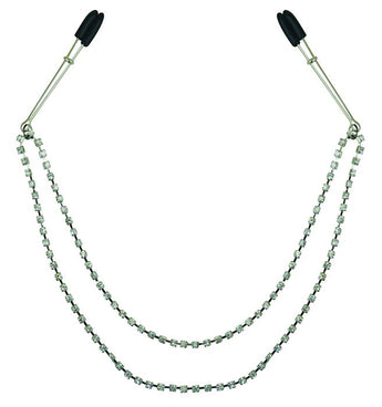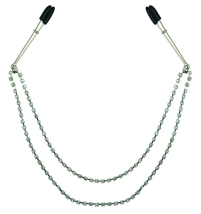 Sportsheets Sincerely Bling Nipple Clips. Style, grace, and amazing taste...all qualities of your dearly beloved. So why not compliment the treasures of their chest with a little more glittering adornment? Double your dangle as you leave your lover's nipples strangled. These tweezer style clamps are easy-to-use and give you complete control of their tightness. The gentle rubber nubs ensure that this chest accessory remains comfortable and secure even during vigorous play. This 20 inches doubled strand of sparkling bling will give you a formal feeling while the rubber tipped nipple clips serve as a constant reminder that all are entitled to feeling a little pain with their pleasure. Materials: cubic zirconia, nickel free metal, copper, stannum, rubber. Includes: one 20 inches black jeweled nipple clips. Limited Lifetime Warranty, Sportsheets will replace any defective product. If the product is not available, Sportsheets will replace it with a similar product of similar function. Video. 2021.