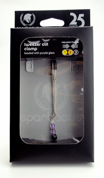 Spartacus Beaded Clit Clamp is available in four colors: sapphire blue, scarlet red, violet purple and petal pink. Each sold separately. Tweezer tip clamp with hanging glass beads can be set to have a gentle or moderate hold depending on where you move the spacer ring. A unique accessory for your BDSM sessions, this elegantly decorated clitoral clamp features sparkling faux crystals on a tweezer-style clamp. Simply place the rubber-tipped ends on either side of her clitoris and slide the adjustment ring to the desired tightness for maximum effect. The gentle weight of the plastic crystals will sway with each movement, offering her pleasure. The decorations also make a devilish target for tapping, tugging, and other stimulation that will keep her on the edge! Color: Silver, Purple. Type: Clitoral Clamp. Material: Metal, Rubber, Plastic. Style: Tweezer Length: 4 inches. Special