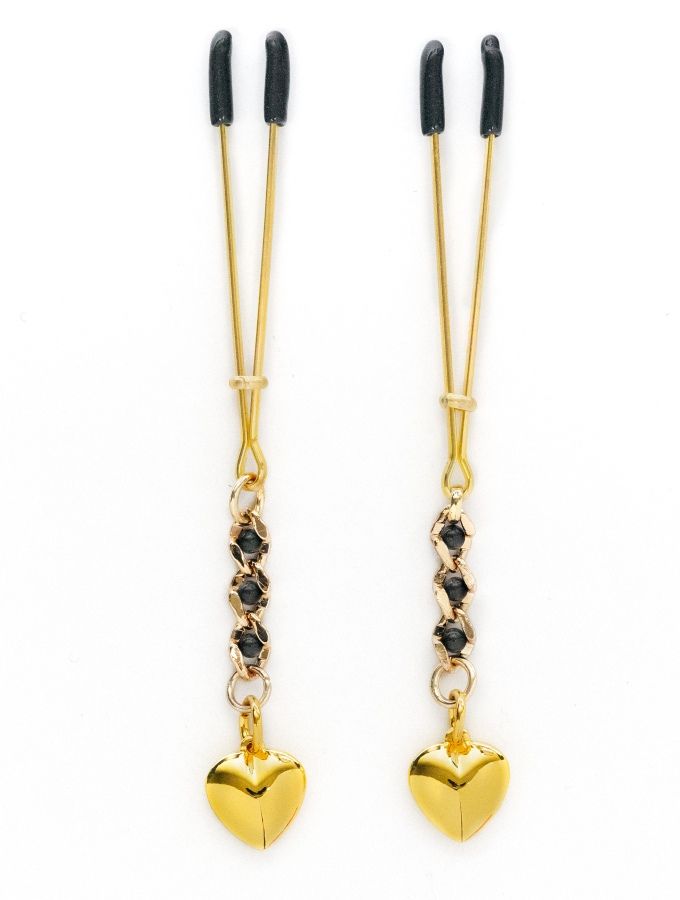 Tweezer Nipple Clamps with Heart Pendant from Spartacus Leather. Adjustable tweezer style nipple clamps with 2 heart pendants on the ends. Soft rubber tips. Adjust the clamps by sliding the metal rings up the tweezers from merely lovely decoration to pretty strong stimulation.