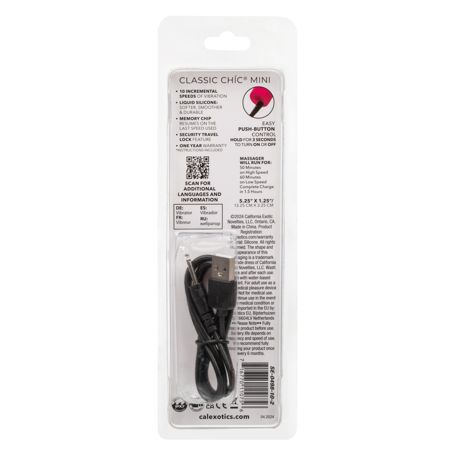 Slip into a world of smooth sensations with the Rechargeable Classic Chic Mini, your sleek companion in the journey of intimate exploration. This liquid silicone mini massager, with its easy push-button operation, is a testament to both luxury and simplicity. It's designed for those who appreciate the finer things in life, providing a soft, smooth, and utterly satisfying touch.