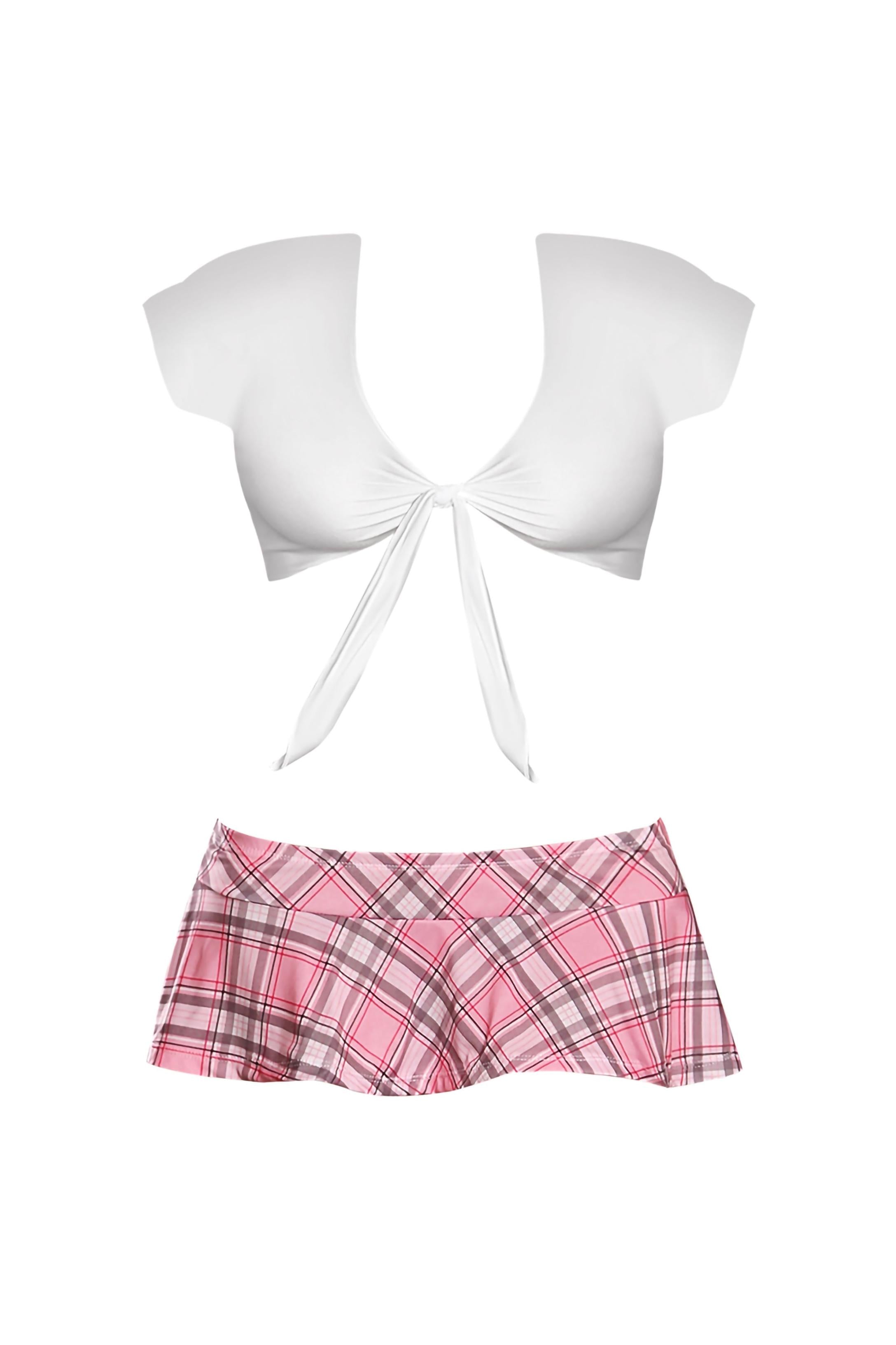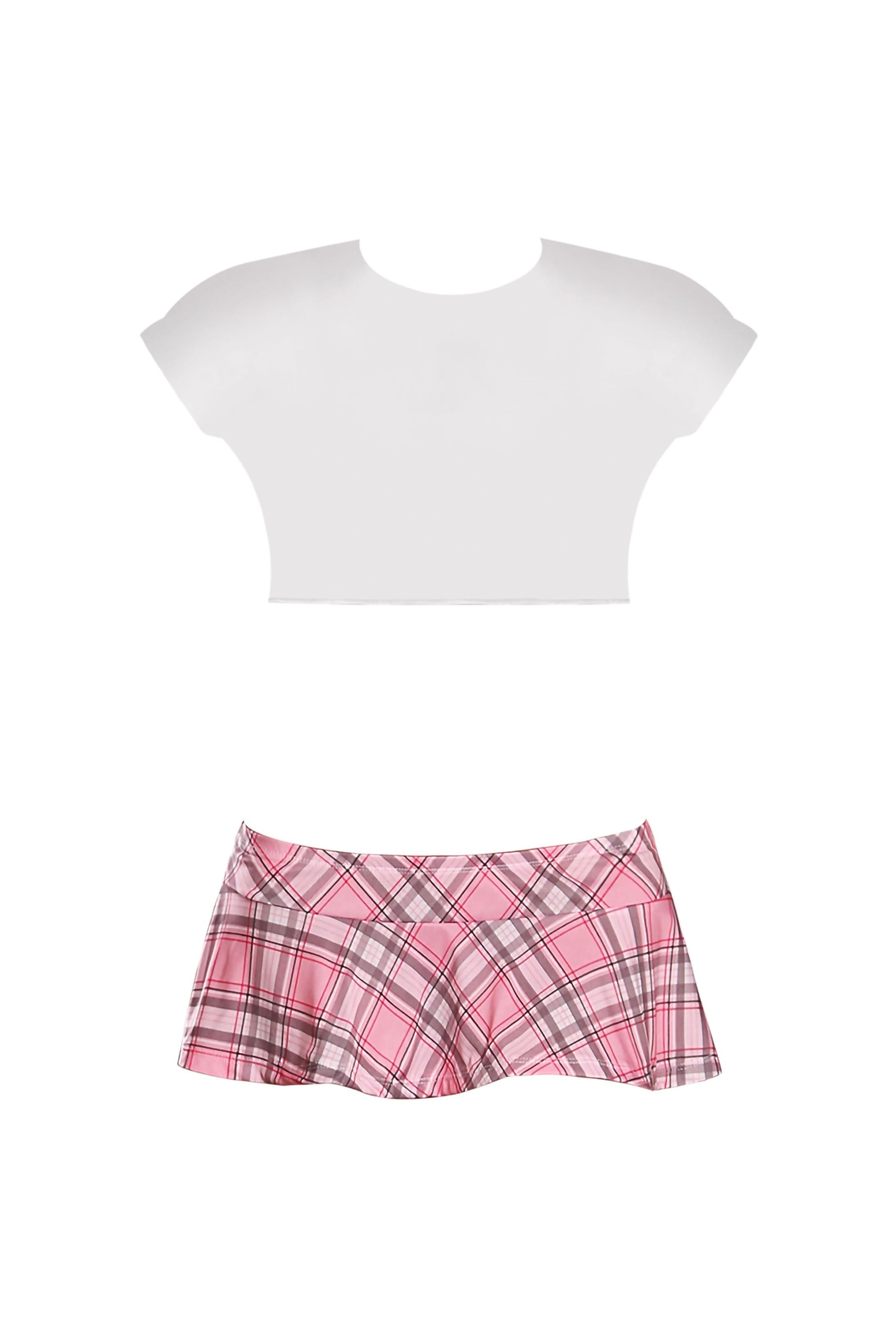 Campus Crush School Girl Plaid School Dress Up Costume Medium from the Magic Silk Lingerie Collection this style School Girl Costume includes: Lycra Top ties in front and features capped sleeves. Micro Mini Skirt has flutter hem and elastic waist. Playful white top complete with a baby pink, black, and white plaid skirt. Knee high socks shown on model, not included. Sold separately. Adult School Girl Costume is made using a blend of 85% Nylon, 15% Spandex. Ladies medium fits dress sizes 8 to 10. Naughty role playing, bedroom, dress up costumes. Magic Silk Lingerie, Naughty Role Playing Wear, Adult Bedroom, Dress Up Costumes. Categories: Clothing, Sexy Clubwear, Lingerie, Clothing, Naughty Role Play, Bedroom, Dress Up Costumes. 2023.