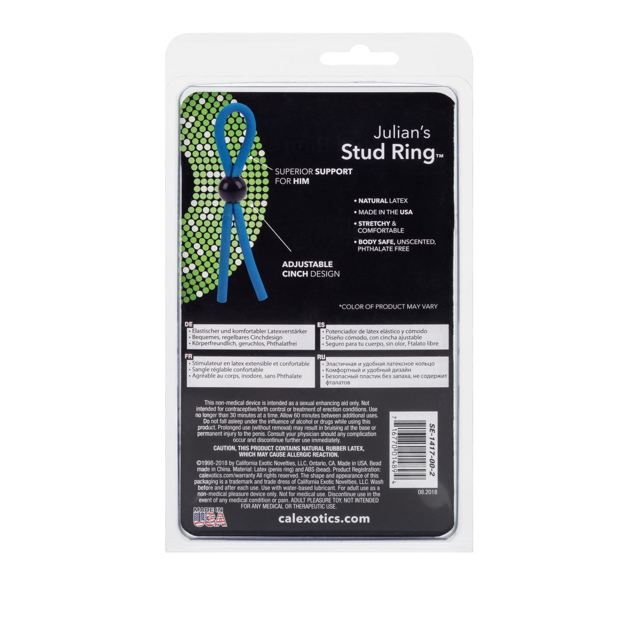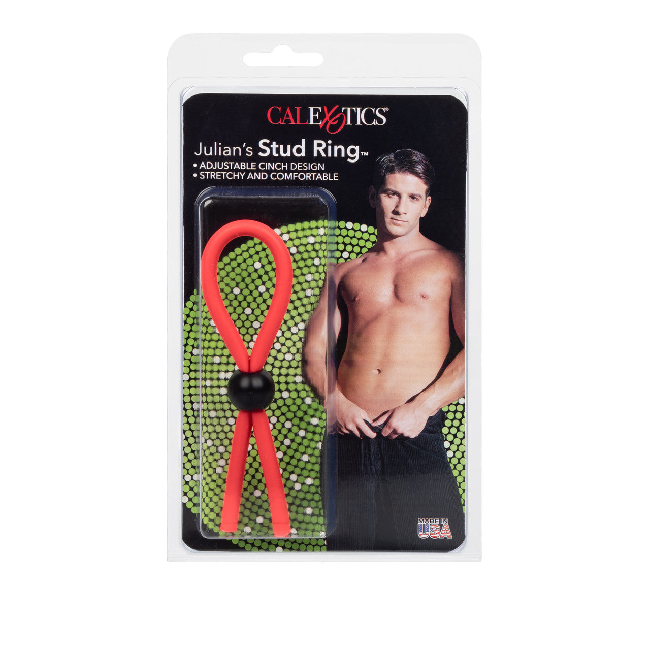 Julian's Stud Ring from California Exotic Novelties. Maximize your sensual performance and stamina with Julian's Stud Ring. The fully adjustable Erection Keeper is designed to extend and enhance your sensuous pleasure, for unlimited mind blowing explosions. The soft Lasso shaped Enhancer comfortably slips over the Erect Penis for instant arousal, stimulation, and support. To find the perfect fit, simply adjust the toggle and get ready to enjoy indulgent ecstasy. The Enhancing Lasso is made from soft, supple and flexible, Latex and is adjustable in length. The stretchy and pliable Lasso Loop easily slips on over the Erect Penis for a comfortable fit that also provides support and stamina enhancement. To adjust the tantalizing tension, simply loosen or tighten the toggle Bead. Once you have the perfect personalized fit, take full control of your arousal, stimulation and performance pleasure. To increase the erotic sensations and sensitivity, it is recommended that you use a quality water based personal lubricant with this enhancement sex toy. Stay rock hard for prolonged experiences, with the fully adjustable enhancing Lasso. The Exotic Erection enhancer is perfect for first time and experienced users and ideal for self gratification stimulation or intimate, sensuous couple’s play. The soft and supple Enhancer can be used along side your favorite vibrating sex toys, and promises playtime satisfaction every time. Before and after every use, remember to clean the adjustable Ring with a toy cleaner spray, or wash in warm, soapy water. Stud Ring is a fully adjustable, supple Cock Ring. This item comes in assorted colors. Sold as one cock ring in assorted vibrant colors. Safe and pure for body and pleasure. Made using phthalate free, non-toxic materials: Latex Ring, ABS Plastic Bead. Ring measures 5 inches long. Bulk weight .3 ounces. Please note assorted color. Sold as one cock ring. Cock rings when worn around the base of the penis and testicles, many users find that cock rings increase sexual pleasure. Prolong Rings, Erection Enhancement, Climax Control Rings, Cock Rings. Wash before and after each use. Always use a water based personal lubricant with this product for maximum pleasure. Important warning: this adult novelty product is intended as a sexual enhancing aid. Not intended for contraception, birth control or treatment of erection conditions. Use no more than 30 minutes at a time. Allow 60 minutes between additional uses. Do not fall asleep or be under the influence of alcohol or drugs while using this product. Prolonged use without removal may result in bruising to the base or permanent injury to the penis. Consult you physician should any complications should occur and discontinue use immediately. Made in the USA. Julian's Stud Ring is a registered trademark for California Exotic Novelties. Sex toys and sexual wellness. Categories: Love Rings, Cock Rings, Sex Toys for Couples, Men, Women, Adjustable, Versatile Cock Rings. 2023.