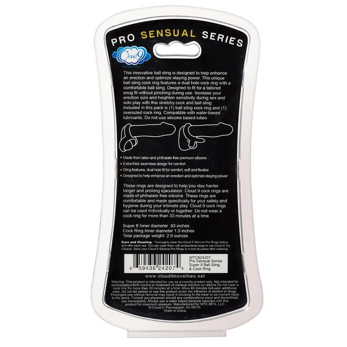 Pro Sensual Pro Rings Silicone Super 8 Ring and Tie Sling 2 Pack. This innovative ball sling is designed to help enhance an erection and optimize staying power. This unique ball sling cock ring features a dual hole cock ring with a comfortable ball sling. Designed to fit for a tailored, snug fit without pinching during use. Increase your erection size and heighten sensitivity during sex and solo play with this stretchy cock and ball sling. Included in this pack is 1 ball sling cock ring and 1 over sized cock ring. Compatible with water based lubricants. Do not use Silicone based lubes. Made from latex and phthalate free premium Silicone. Extra thick seamless design for comfort. Sling features, dual hole fit for comfort, soft and flexible. Designed to help enhance an erection and optimize staying power. These rings are designed to help you stay harder longer and prolong ejaculation. Cloud 9 cock rings are made of phthalate free Silicone. These rings are comfortable and made specifically for your safety and hygiene during your intimate play. Cloud 9 cock rings can be used individually or together. Do not wear a cock ring for more than 30 minutes at a time. Super 8 inner diameter .93 inch. Cock ring inner diameter 1.0 inch. Total package weight: 2.9 ounces. Care and cleaning: thoroughly clean the Cloud 9 Silicone Pro Rings before and after each use. You can wash them with antibacterial soap or use Cloud 9 Toy Cleaner. Store your Cloud 9 Silicone Pro Rings in a cool dry place after cleaning. Categories: Love Rings, Cock Rings, Adjustable, Versatile Cock Rings. 2023.