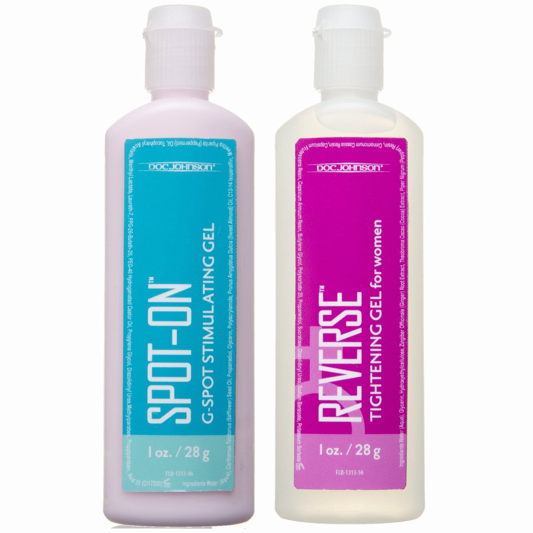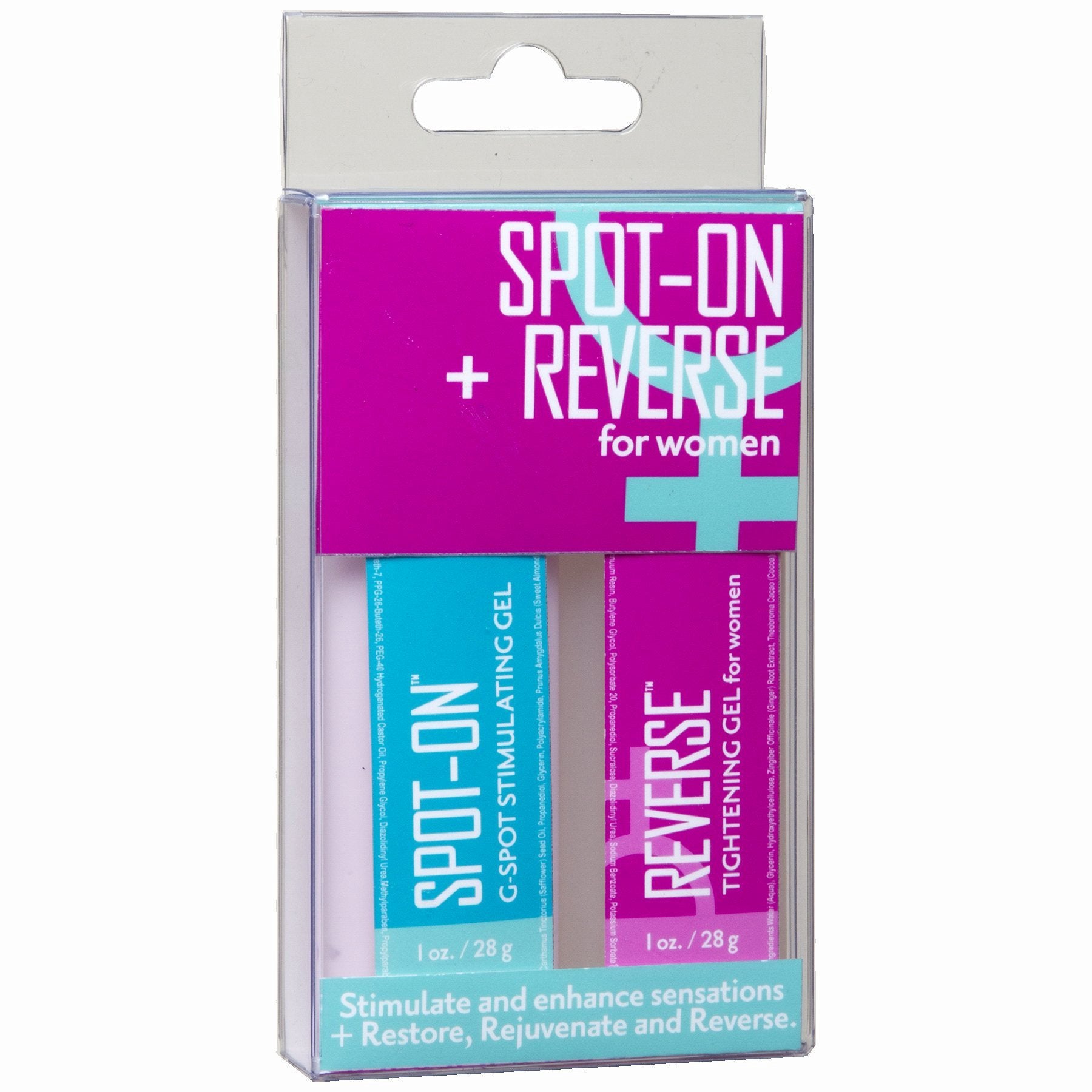 Spot On Plus Reverse for Women 2 Pack. Increase your pleasure with this travel friendly sexual enhancement kit! Spot On and Reverse for Women features a 1 ounce G-spot stimulating gel and 1 ounce tightening gel. The G-spot stimulating gel, Spot On, is a silky formula that intensifies sensation in and around the G-spot; while the tightening gel, Reverse, works to tone and temporarily tighten vaginal tissue. Both formulas are odorless, tasteless, and derived from natural ingredients. Products features: Sexual Enhancement Kit. 1 ounce travel friendly tubes. Odorless. Tasteless. Derived from Natural Ingredients including Ginger, Peppermint and Cocoa Extracts. Proudly, made in America.
