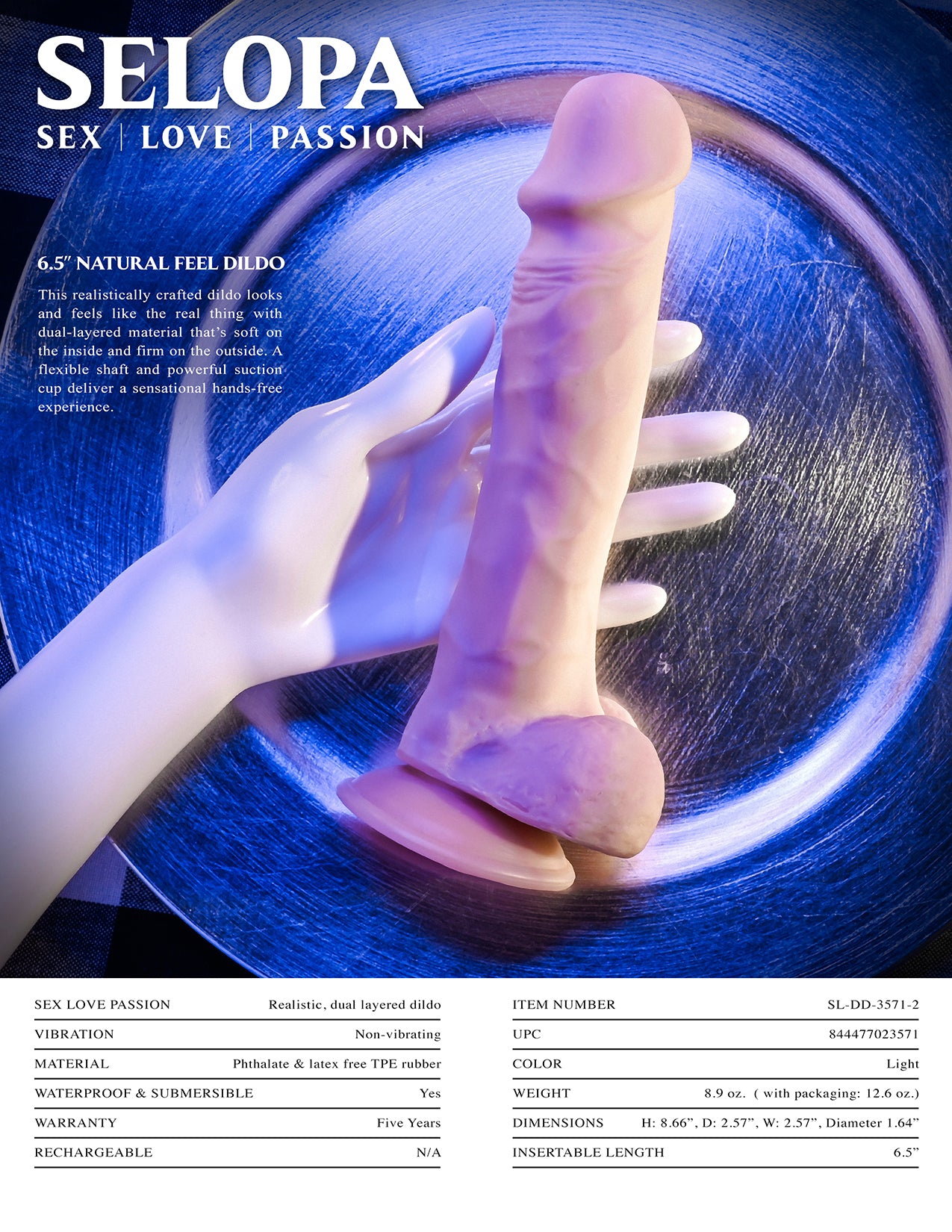 Evolved 6.5 inches Natural Feel Dildo Light Skin Tone Beige from Selopa. Sex, Love, Passion. This realistic dildo looks and feels like the real thing with dual layered materials that is soft on the ouside and firm on the outside. A flexible shaft and powerful suction cup deliver a sensational hands free experience for solo play or harness compatible for partner play. Made with body safe materials both phthalates free and latex free. Size length 8.66 inches by 2.57 inches depth by 2.57 inches in width. Insertion length 6.5 inches and 1.64 inches insertion diameter. Bulk weight 8.9 ounces. Package shipping weight 12.6 ounces. Always clean before and after use. Rinse with warm water. Pat dry before storing. Use a water based personal lubricant. Do not use oil base personal lubricants. These can corrode the toys materials. Please note Dildo does not vibrate. Waterproof. Care: clean product with adult toy cleaner or soap and water. Followed by a warm water rinse. Pat dry before storing. 5 years warranty. Categories: Dildos, Dongs, Realistic Small, Medium Dildos, Dildos and Dongs Realistic. 2023.
