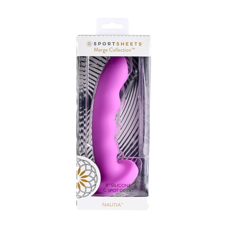 Nautia 8 inches Silcone Dildo Purple from Sportsheets. The Nautia 8 inches, solid Silicone dildo from the Sportsheets Merge Collection is the creation of pleasure and versatility combined. With its flared base, Nautia can be used with O-Ring and underwear style harnesses and used externally or internally for partner and solo play. The ample curvature, nonrealistic pleasure bump shaft and tapered tip encourages G-Spot and P-Spot stimulation, and the soft Silicone creates an ultra smooth sensation making it feel like a dream. Merge with pleasure. How to use: apply water based lubricant to your toy to enhance experience or pair with 1.75 inches O-Ring for strap on play. Compatible with Dildo and Harness Silicone Cushion.