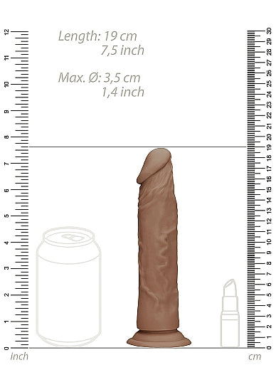 Realrock 7 inches Dong Tan Medium Skin Tone without Testicles from Shots Toys. Enjoy the Skin of velvet soft, life like skin with this incredibly realistic dildo. Meticulously designed with a pronounced head, bulging veins, and no hanging balls. The super life like shapes, textures, and colors of this dong truly look and feel like the real thing! Made from Phthalate free Skin Thermoplastic Elastomers TPE, this squishy material mimics the softness of real skin and is completely body safe. This beautifully crafted dildo is made by injection molding in order to eliminate smell and defects and at the same time increase its thermo stability and durability. The ultra strong suction cup sticks to nearly any clean, smooth or flat surface. The suction cup also doubles as a harness compatible base that remains snug in its place even when the action gets hot! Details: dimensions package 5.91 inches by 2.8 inches by 10.63 inches. Weight package 8.29 ounces. Product dimensions 1.93 inches by 1.93 inches by 9.45 inches. Product diameter 1.38 inches. Insertable length 5.31 inches. *Circle on the right side of the image Renewed = Means New, Improved Packaging. Shots Toys - Realrock. 2022.
