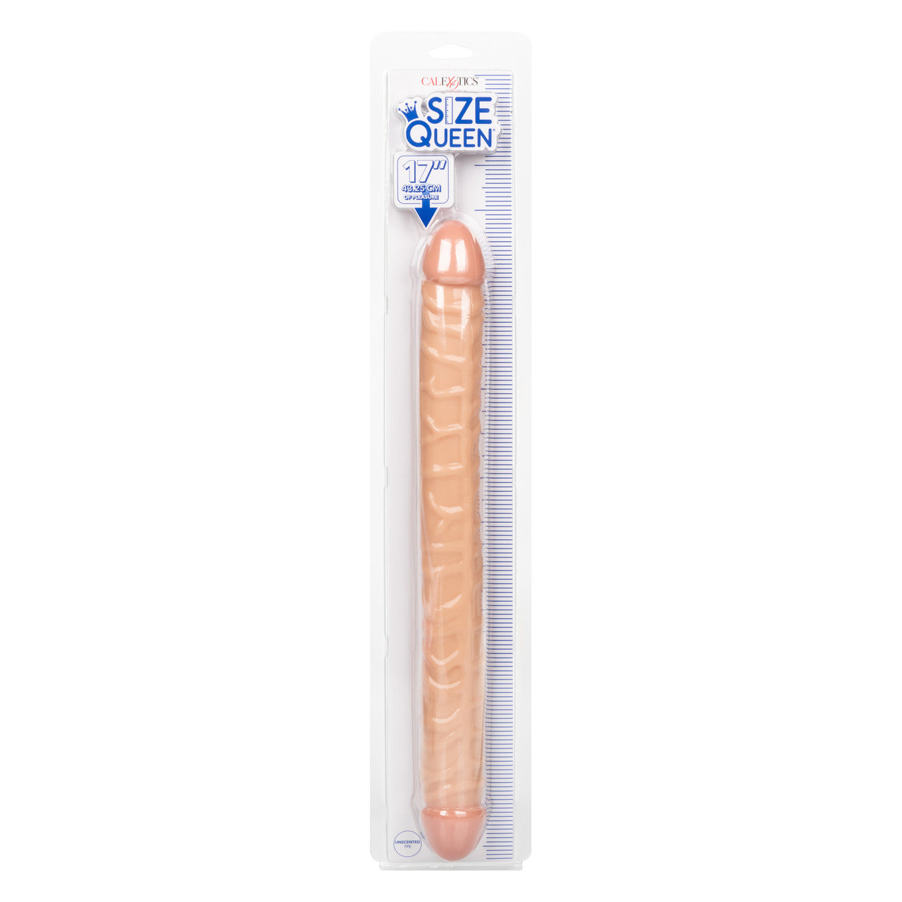 Size Queen 17 inches Ivory Light Skin Tone Extra Long Dildo from California Exotic Novelties. Indulge in your naughtiest fantasies and give yourself over to double penetrating pleasure with the powerful Size Queen 17 inches dong. The daring double ended dong has a 17 inches shaft, multi-directional design and life like textured surface. This naughty dildo has two life like ends meant to deliver thrilling double penetration for knee shaking sensations. The plump, pliable shaft moves with you and flexes with intimate curves from the multi-directional body. This big, bad dong is made for those noble size queens looking for a ride fit for your insatiable appetite.