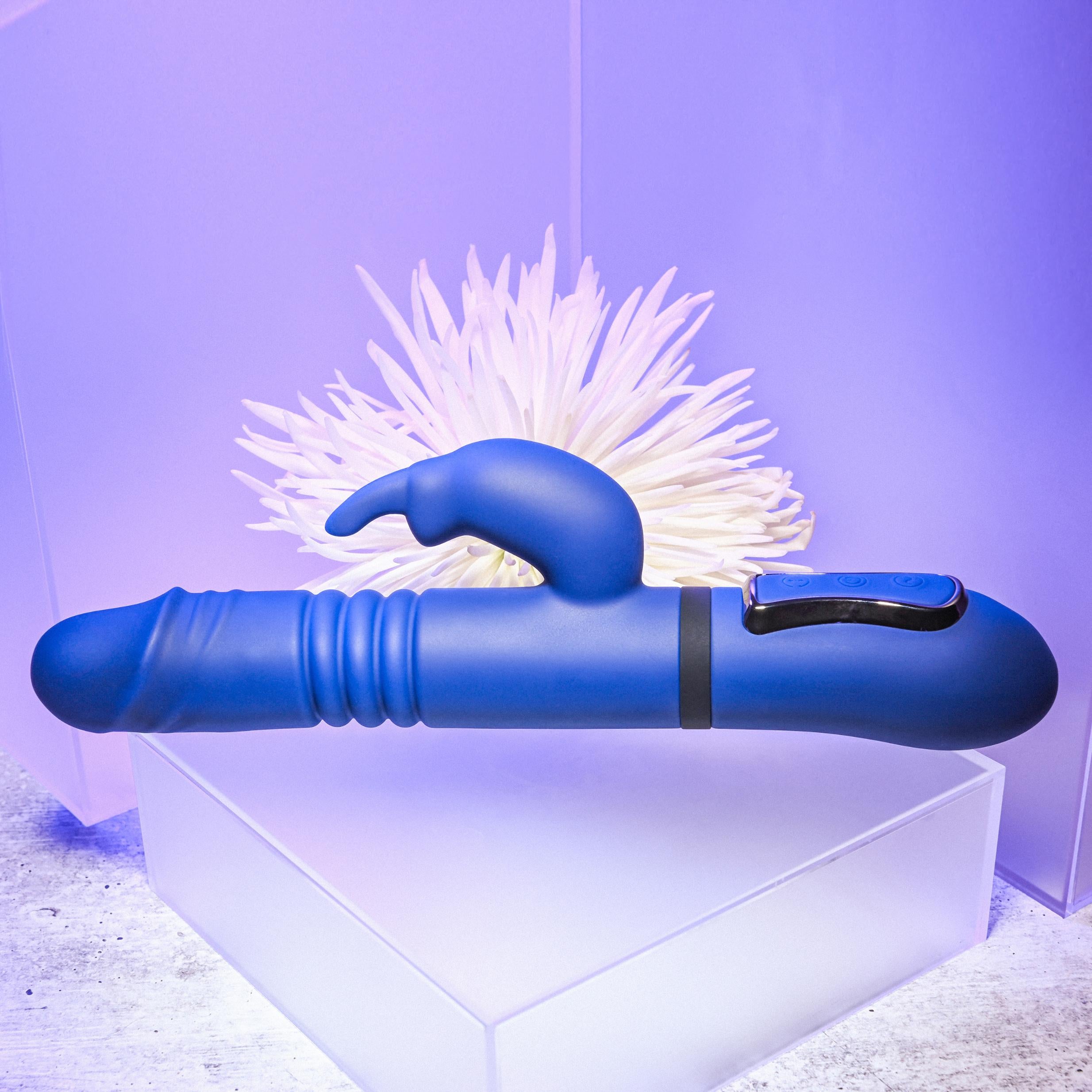 This tall, smooth rabbit vibe is ready to thrust all night! With a supple, textured tip and an accordion center that stretches in and out, you'll be amazed at the look and feel of the powerful thrust function. But this large fully submersible shape has a few more secrets up its sleeve - a powerful rabbit shaft whose bunny ears just won't quit, and rotating beads in the shaft that churn and spin with an erotic rhythm perfect for any massage! Between the thrusting, rotating and powerful vibrations, you'll be headed for a mind- melting experience in no time, especially with the ergonomic controls that let you customize as you go. Fully rechargeable and easy to clean!