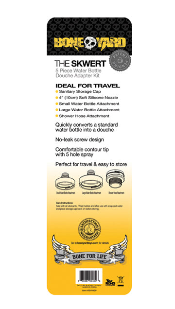 Boneyard Skwert 5 Piece Water Bottle Douche Adapter Kit. This anytime anywhere douche is specifically made for those encounters when you do not have time to fully prepare. The Silicone nozzle comes with 2 threaded adapters that fit most water bottles. This must have man on man tool is designed to fit in your back pocket for an on the go clean for those inopportune moments that you just can not pass up. Forget finding a shower hose, just find a bottle of water, screw it on, and you are ready to go! The powerful and iconic Boneyard branded design has a sleek 5 hole Silicone nozzle and features 2 different threaded adapters that fit most water bottles. The kit also comes with a hose adapter so you can use the nozzle on your favorite shower hose. Ideal for travel, on the go, and everyday use. You can be assured the Skwert will get you through the punishment of your longest play sessions time and time again. The 4 inches silicone nozzle is 100% soft touch Silicone. The adapters are solid ABS construction with a small thread and large thread fitting for a non leak fit. The kit also comes with a standard thread shower hose adapter and sanitary storage cap.