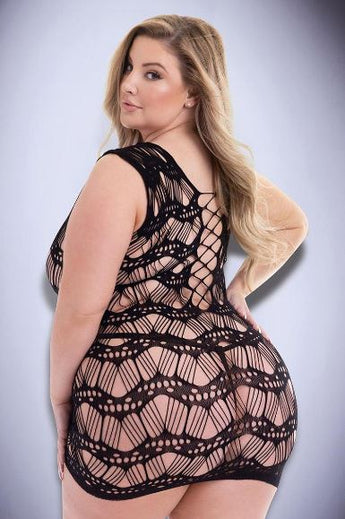 You'll be all laced up and loving it in Baci's newest mini dress! Available in crimson red and midnight black, this sheer lace mini features a unique and seductive pattern of laced up cutouts and wavy fishnetting. The wide, corset-laced cutouts (front and back!) and thigh-skimming length accent all of your delicious curve!
