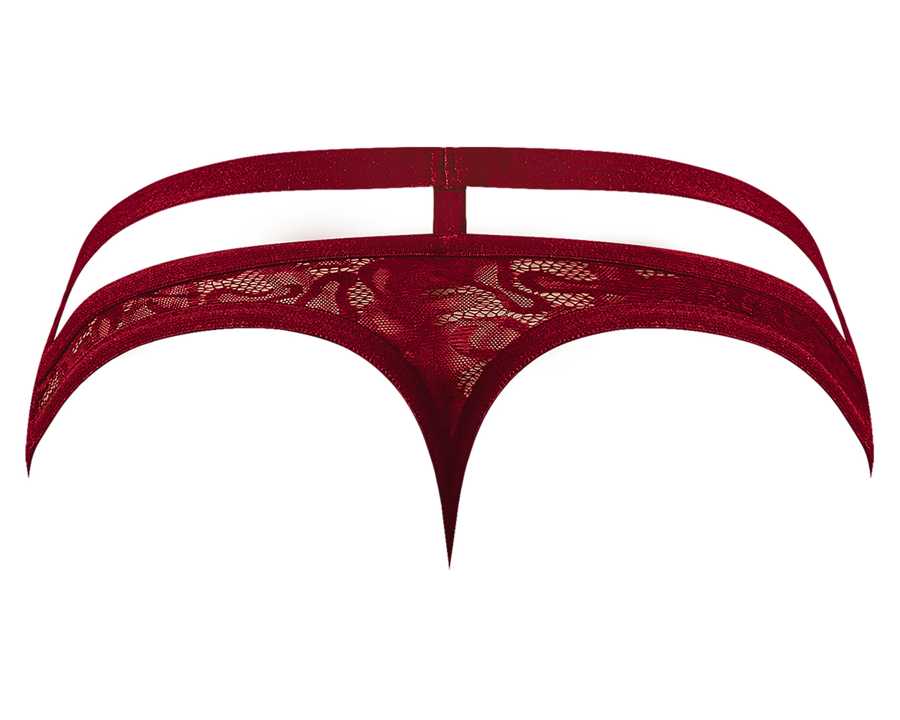 Lucifer Cutout Thong Burgandy L/XL from Male Power Lingerie. From the Lucifer collection by Male Power, the Strappy Jock consists of a full lace pouch secured by plush elastic strapping, criss crossed in front and butt boosting in back. Men Sizes Large to Extra Large. Waist 36 inches to 42 inches. Categories: Lingerie, Clothing, Naughty Role Play, Men's Underwear, Men's Fetish Wear. 2024.