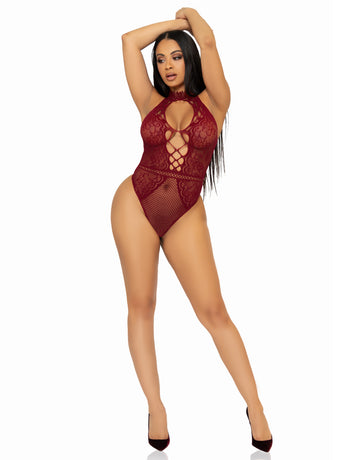 Net and Lace Keyhole Halter Bodysuit - One Size - Burgundy